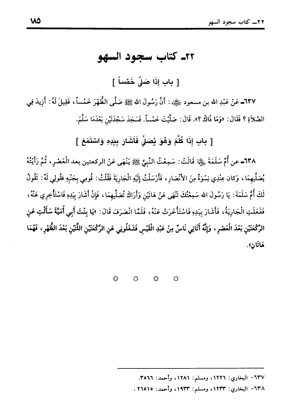 637 - عَنْ عَبْدِ اللَّهِ بْنِ مَسْعُوْدٍ - رضي الله عنه -: أَنَّ رَسُولَ اللَّهِ - صلى الله عليه وسلم - صَلَّى الظُّهْرَ خَمْسًا فَقِيلَ لَهُ: أَزِيدَ فِي الصَّلاةِ؟ فَقَالَ: «وَمَا ذَاكَ»؟ قَالَ: صَلَّيْتَ خَمْسًا، فَسَجَدَ سَجْدَتَيْنِ بَعْدَ مَا سَلَّمَ. (بخاري: 1226)