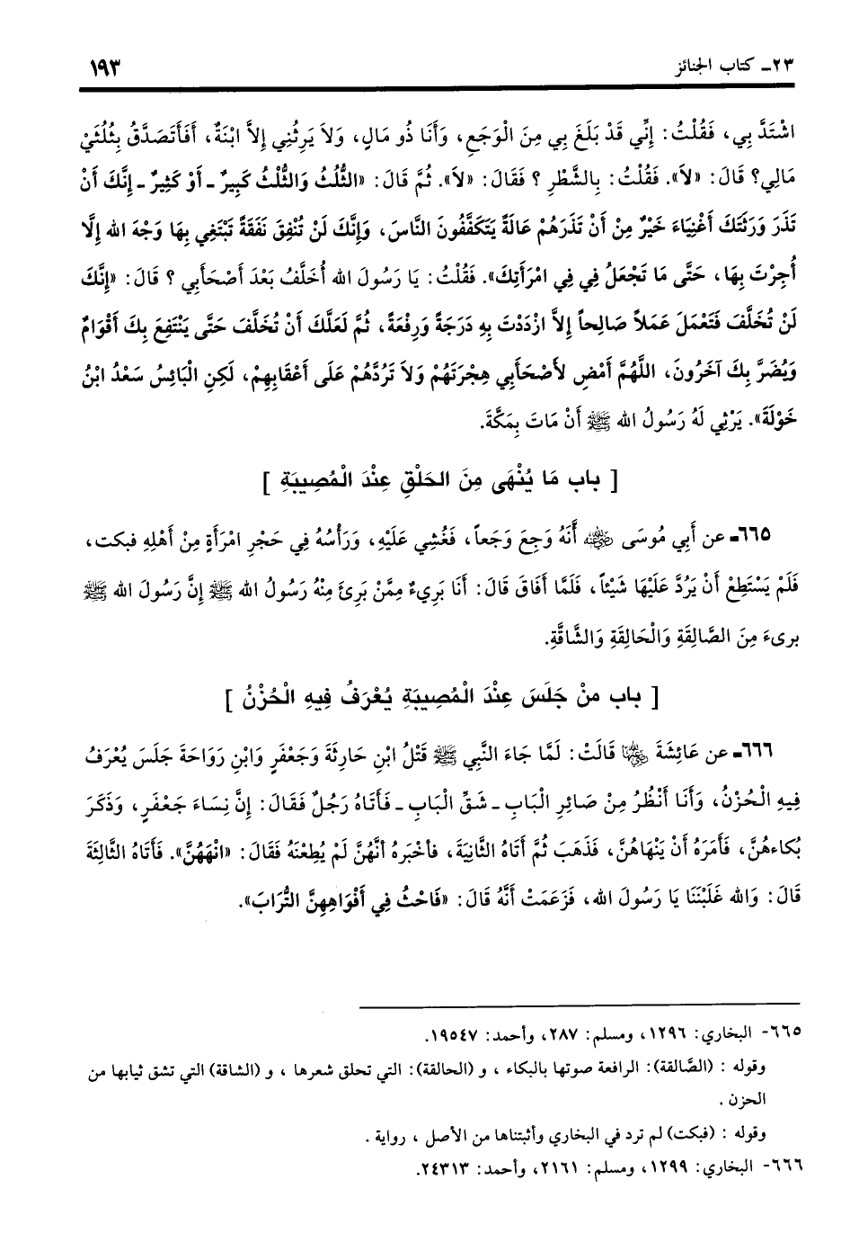 665 - عَنْ أَبِيْ مُوسَى - رضي الله عنه -: أَنَّهُ وَجِعَ وَجَعًا شَدِيدًا فَغُشِيَ عَلَيْهِ وَرَأْسُهُ فِي حَجْرِ امْرَأَةٍ مِنْ أَهْلِهِ، فبكت فَلَمْ يَسْتَطِعْ أَنْ يَرُدَّ عَلَيْهَا شَيْئًا، فَلَمَّا أَفَاقَ قَالَ: أَنَا بَرِيءٌ مِمَّنْ بَرِئَ مِنْهُ رَسُولُ اللَّهِ - صلى الله عليه وسلم -، إِنَّ رَسُولَ اللَّهِ - صلى الله عليه وسلم - بَرِئَ مِنَ الصَّالِقَةِ وَالْحَالِقَةِ وَالشَّاقَّةِ. (بخاري: 1296)