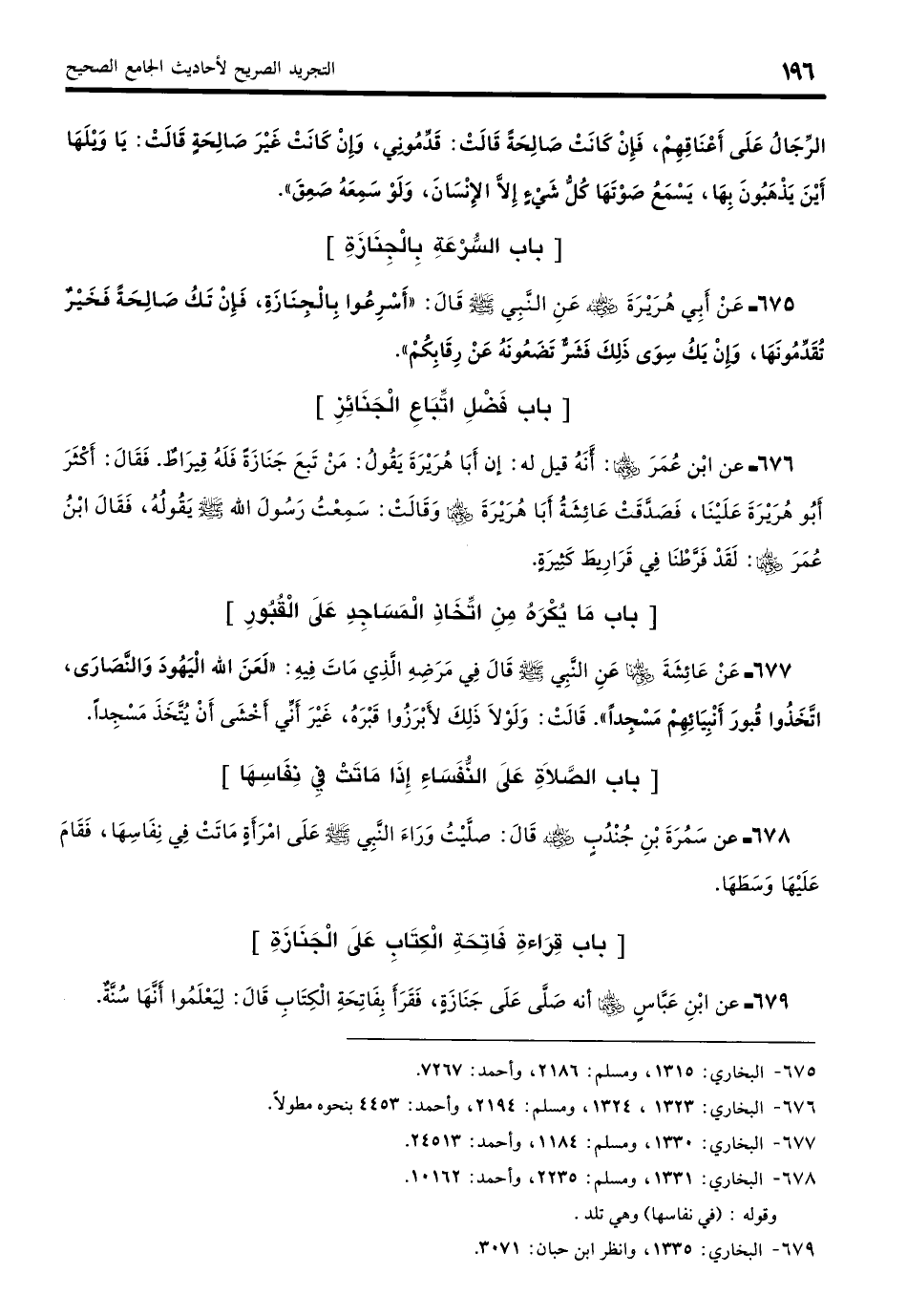 675 - عَنْ أَبِي هُرَيْرَةَ - رضي الله عنه - عَنِ النَّبِيِّ - صلى الله عليه وسلم - قَالَ: «أَسْرِعُوا بِالْجِنَازَةِ، فَإِنْ تَكُ صَالِحَةً فَخَيْرٌ تُقَدِّمُونَهَا إليه، وَإِنْ يَكُ سِوَى ذَلِكَ فَشَرٌّ تَضَعُونَهُ عَنْ رِقَابِكُمْ». (بخاري: 1315)
