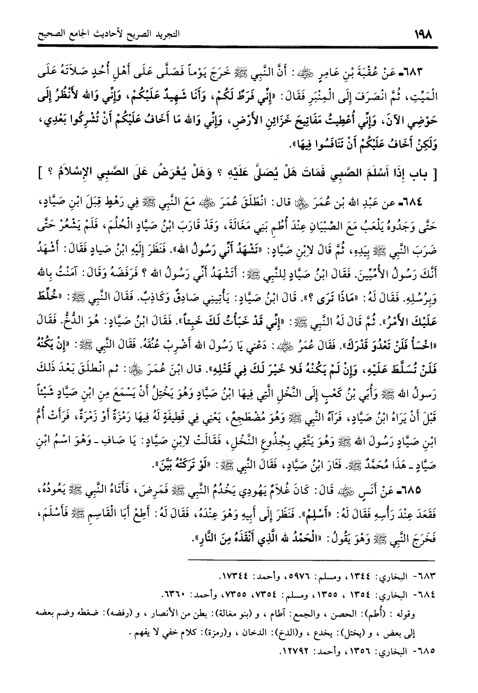 684 - عَنِ ابْنِ عُمَرَ - رضي الله عنهما - قال: انْطَلَقَ عُمَرَ - رضي الله عنه - مَعَ النَّبِيِّ - صلى الله عليه وسلم - فِي رَهْطٍ قِبَلَ ابْنِ صَيَّادٍ، حَتَّى وَجَدُوهُ يَلْعَبُ مَعَ الصِّبْيَانِ عِنْدَ أُطُمِ بَنِي مَغَالَةَ وَقَدْ قَارَبَ ابْنُ صَيَّادٍ الْحُلُمَ، فَلَمْ يَشْعُرْ حَتَّى ضَرَبَ النَّبِيُّ - صلى الله عليه وسلم - بِيَدِهِ ثُمَّ قَالَ لابْنِ صَيَّادٍ: «تَشْهَدُ أَنِّي رَسُولُ اللَّهِ»؟ فَنَظَرَ إِلَيْهِ ابْنُ صَيَّادٍ فَقَالَ: أَشْهَدُ أَنَّكَ رَسُولُ الأُمِّيِّينَ. فَقَالَ ابْنُ صَيَّادٍ لِلنَّبِيِّ - صلى الله عليه وسلم -: أَتَشْهَدُ أَنِّي رَسُولُ اللَّهِ؟ فَرَفَضَهُ، وَقَالَ: «آمَنْتُ بِاللَّهِ وَبِرُسُلِهِ». فَقَالَ لَهُ: «مَاذَا تَرَى»؟ قَالَ ابْنُ صَيَّادٍ: يَأْتِينِي صَادِقٌ وَكَاذِبٌ، فَقَالَ النَّبِيُّ - صلى الله عليه وسلم -: «خُلِّطَ عَلَيْكَ الأَمْرُ». ثُمَّ قَالَ لَهُ النَّبِيُّ - صلى الله عليه وسلم -: «إِنِّي قَدْ خَبَأْتُ لَكَ خَبِيئًا». فَقَالَ ابْنُ صَيَّادٍ: هُوَ الدُّخُّ، فَقَالَ: «اخْسَأْ فَلَنْ تَعْدُوَ قَدْرَكَ». فَقَالَ عُمَرُ - رضي الله عنه -: دَعْنِي يَا رَسُولَ اللَّهِ أَضْرِبْ عُنُقَهُ. فَقَالَ النَّبِيُّ - صلى الله عليه وسلم -: «إِنْ يَكُنْهُ فَلَنْ تُسَلَّطَ عَلَيْهِ، وَإِنْ لَمْ يَكُنْهُ فَلا خَيْرَ لَكَ فِي قَتْلِهِ». قَالَ ابْنُ عُمَرَ - رضي الله عنهما -: ثُمَّ انْطَلَقَ بَعْدَ ذَلِكَ رَسُولُ اللَّهِ - صلى الله عليه وسلم -، وَأُبَيُّ بْنُ كَعْبٍ إِلَى النَّخْلِ الَّتِي فِيهَا ابْنُ صَيَّادٍ وَهُوَ يَخْتِلُ أَنْ يَسْمَعَ مِنِ ابْنِ صَيَّادٍ شَيْئًا قَبْلَ أَنْ يَرَاهُ ابْنُ صَيَّادٍ، فَرَآهُ النَّبِيُّ - صلى الله عليه وسلم - وَهُوَ مُضْطَجِعٌ -يَعْنِي فِي قَطِيفَةٍ لَهُ فِيهَا رَمْزَةٌ أَوْ زَمْرَةٌ- فَرَأَتْ أمُّ ابْنِ صَيّادٍ رَسُولَ اللَّهِ - صلى الله عليه وسلم - وَهُوَ يَتَّقِي بِجُذُوعِ النَّخْلِ فَقَالَتْ لابْنِ صَيَّادٍ: يَا صَافِ، وَهُوَ اسْمُ ابْنِ صَيَّادٍ، هَذَا مُحَمَّدٌ - صلى الله عليه وسلم -، فَثَارَ ابْنُ صَيَّادٍ، فَقَالَ النَّبِيُّ - صلى الله عليه وسلم -: «لَوْ تَرَكَتْهُ بَيَّنَ». (بخاري: 1354، 1355)