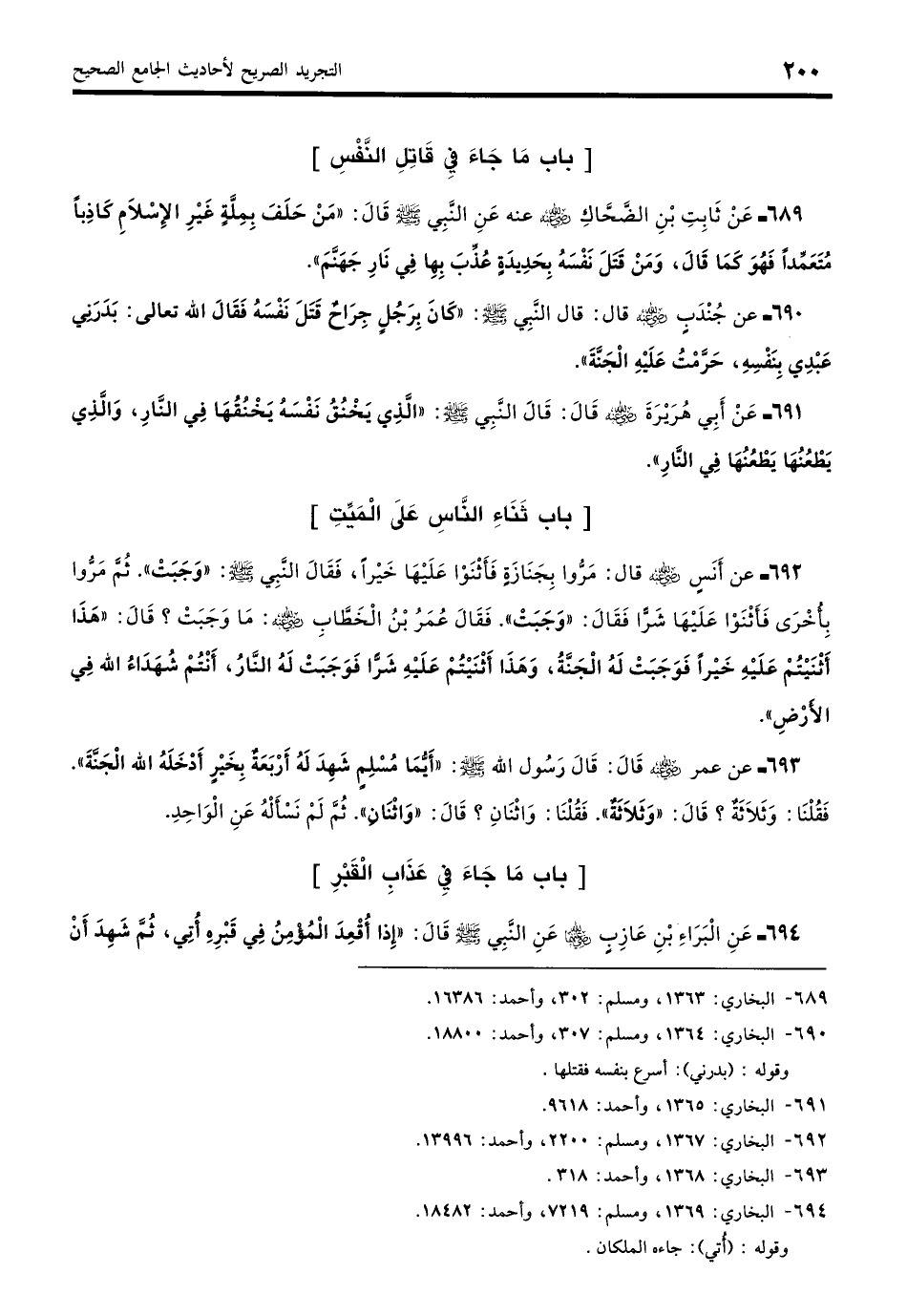 690 - عَن جُنْدَبٍ - رضي الله عنه - عَنِ النَّبِيِّ - صلى الله عليه وسلم - قَالَ: «كَانَ بِرَجُلٍ جِرَاحٌ فَقَتَلَ نَفْسَهُ، فَقَالَ اللَّهُ: بَدَرَنِي عَبْدِي بِنَفْسِهِ، حَرَّمْتُ عَلَيْهِ الْجَنَّةَ». (بخاري: 1364)