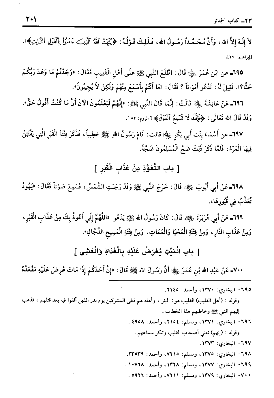 695 - عَنِ ابْنِ عُمَرَ - رضي الله عنهما - قَالَ: اطَّلَعَ النَّبِيُّ - صلى الله عليه وسلم - عَلَى أَهْلِ الْقَلِيبِ فَقَالَ: «وَجَدْتُمْ مَا وَعَدَ رَبُّكُمْ حَقًّا»؟ فَقِيلَ لَهُ: تَدْعُو أَمْوَاتًا؟ فَقَالَ: «مَا أَنْتُمْ بِأَسْمَعَ مِنْهُمْ وَلَكِنْ لا يُجِيبُونَ». (بخاري: 1370)