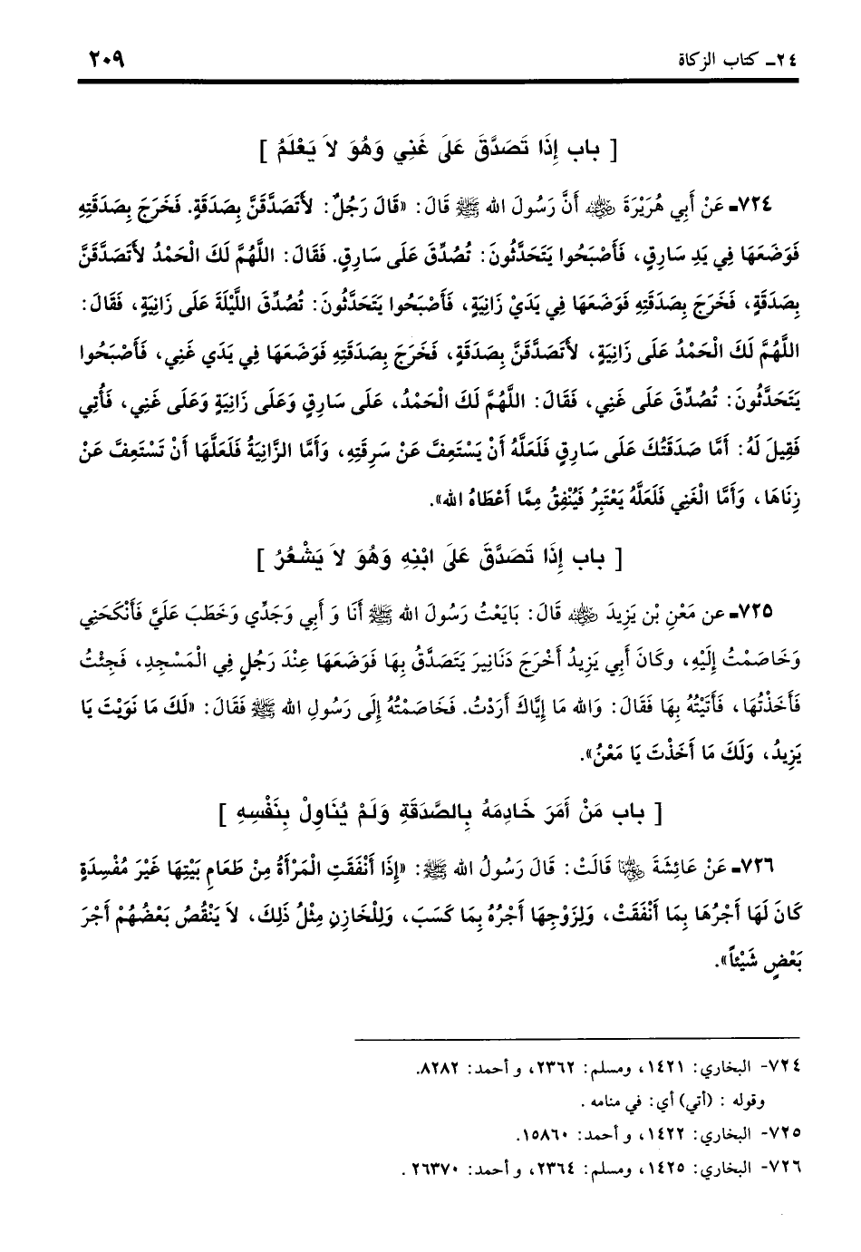 724 - عَنْ أَبِي هُرَيْرَةَ - رضي الله عنه -: أَنَّ رَسُولَ اللَّهِ - صلى الله عليه وسلم - قَالَ: «قَالَ رَجُلٌ: لأَتَصَدَّقَنَّ بِصَدَقَةٍ، فَخَرَجَ بِصَدَقَتِهِ فَوَضَعَهَا فِي يَدِ سَارِقٍ، فَأَصْبَحُوا يَتَحَدَّثُونَ: تُصُدِّقَ عَلَى سَارِقٍ. فَقَالَ: اللَّهُمَّ لَكَ الْحَمْدُ، لأَتَصَدَّقَنَّ بِصَدَقَةٍ، فَخَرَجَ بِصَدَقَتِهِ فَوَضَعَهَا فِي يَدَيْ زَانِيَةٍ، فَأَصْبَحُوا يَتَحَدَّثُونَ: تُصُدِّقَ اللَّيْلَةَ عَلَى زَانِيَةٍ، فَقَالَ: اللَّهُمَّ لَكَ الْحَمْدُ، عَلَى زَانِيَةٍ، لأَتَصَدَّقَنَّ بِصَدَقَةٍ، فَخَرَجَ بِصَدَقَتِهِ فَوَضَعَهَا فِي يَدَيْ غَنِيٍّ، فَأَصْبَحُوا يَتَحَدَّثُونَ: تُصُدِّقَ عَلَى غَنِيٍّ، فَقَالَ: اللَّهُمَّ لَكَ الْحَمْدُ عَلَى سَارِقٍ، وَعَلَى زَانِيَةٍ، وَعَلَى غَنِيٍّ، فَأُتِيَ فَقِيلَ لَهُ: أَمَّا صَدَقَتُكَ عَلَى سَارِقٍ فَلَعَلَّهُ أَنْ يَسْتَعِفَّ عَنْ سَرِقَتِهِ، وَأَمَّا الزَّانِيَةُ فَلَعَلَّهَا أَنْ تَسْتَعِفَّ عَنْ زِنَاهَا، وَأَمَّا الْغَنِيُّ فَلَعَلَّهُ يَعْتَبِرُ فَيُنْفِقُ مِمَّا أَعْطَاهُ اللَّهُ». (بخاري: 1421)