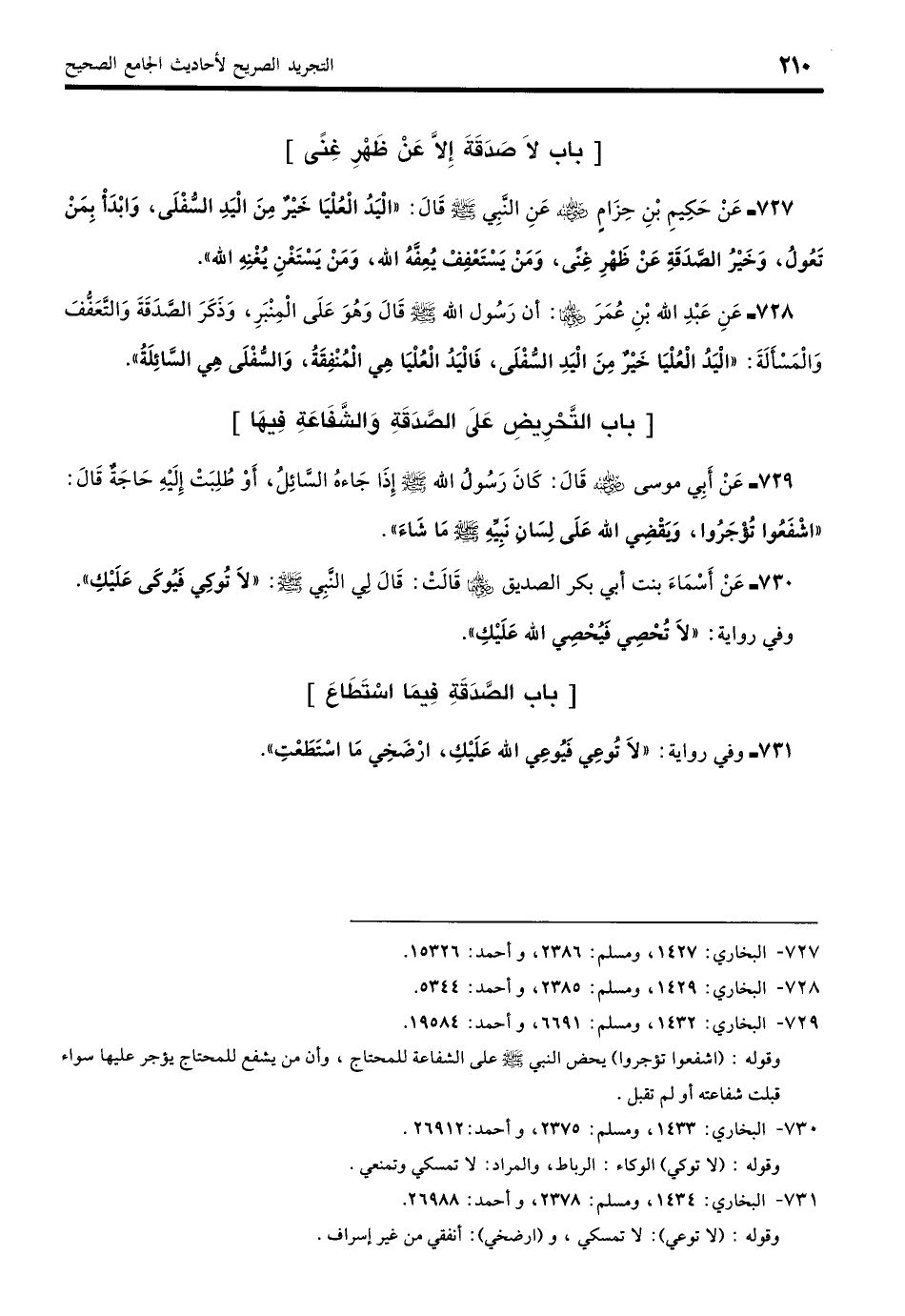 730 - عَنْ أَسْمَاءَ - رضي الله عنها - قَالَتْ: قَالَ لِيَ النَّبِيُّ - صلى الله عليه وسلم -: «لا تُوكِي فَيُوكَى عَلَيْكِ». وفي رواية: قَالَ: «لا تُحْصِي فَيُحْصِيَ اللَّهُ عَلَيْكِ». (بخاري: 1433)