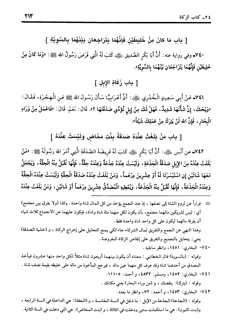 742 - عَنْ أَنَسٍ - رضي الله عنه -: أَنَّ أَبَا بَكْرٍ - رضي الله عنه - كَتَبَ لَهُ فَرِيضَةَ الصَّدَقَةِ الَّتِي أَمَرَ اللَّهُ رَسُولَهُ - صلى الله عليه وسلم -: «مَنْ بَلَغَتْ عِنْدَهُ مِنَ الإِبِلِ صَدَقَةُ الْجَذَعَةِ وَلَيْسَتْ عِنْدَهُ جَذَعَةٌ وَعِنْدَهُ حِقَّةٌ فَإِنَّهَا تُقْبَلُ مِنْهُ الْحِقَّةُ وَيَجْعَلُ مَعَهَا شَاتَيْنِ إِنِ اسْتَيْسَرَتَا لَهُ أَوْ عِشْرِينَ دِرْهَمًا، وَمَنْ بَلَغَتْ عِنْدَهُ صَدَقَةُ الْحِقَّةِ وَلَيْسَتْ عِنْدَهُ الْحِقَّةُ وَعِنْدَهُ الْجَذَعَةُ فَإِنَّهَا تُقْبَلُ مِنْهُ الْجَذَعَةُ وَيُعْطِيهِ الْمُصَدِّقُ عِشْرِينَ دِرْهَمًا أَوْ شَاتَيْنِ، وَمَنْ بَلَغَتْ عِنْدَهُ