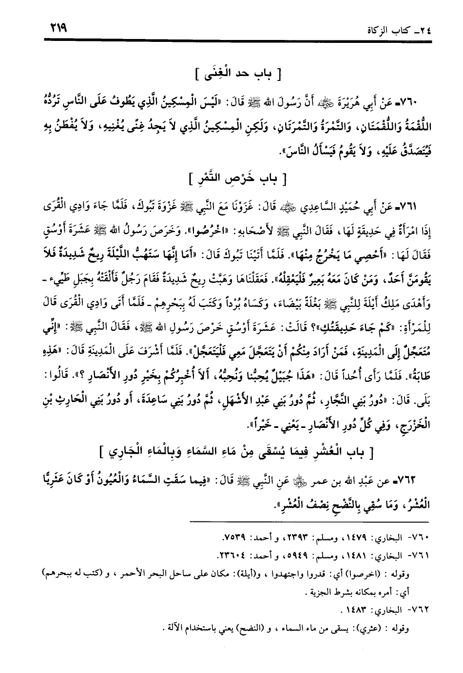 762 - عَنْ عَبْدِ اللَّهِ بْنِ عُمَرَ - رضي الله عنهما - عَنِ النَّبِيِّ - صلى الله عليه وسلم - قَالَ: «فِيمَا سَقَتِ السَّمَاءُ وَالْعُيُونُ، أَوْ كَانَ عَثَرِيًّا، الْعُشْرُ، وَمَا سُقِيَ بِالنَّضْحِ نِصْفُ الْعُشْرِ». (بخاري: 1483)