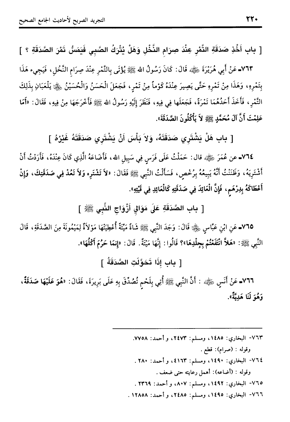 766 - عَنْ أَنَسٍ - رضي الله عنه -: أَنَّ النَّبِيَّ - صلى الله عليه وسلم - أُتِيَ بِلَحْمٍ تُصُدِّقَ بِهِ عَلَى بَرِيرَةَ، فَقَالَ: «هُوَ عَلَيْهَا صَدَقَةٌ، وَهُوَ لَنَا هَدِيَّةٌ». (بخاري: 1495)