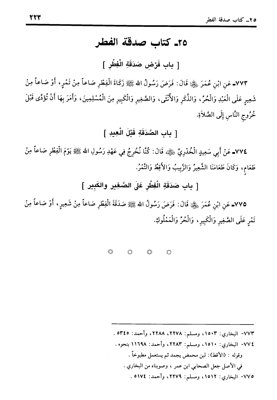 773 - عَنِ ابْنِ عُمَرَ - رضي الله عنهما - قَالَ: فَرَضَ رَسُولُ اللَّهِ - صلى الله عليه وسلم - زَكَاةَ الْفِطْرِ صَاعًا مِنْ تَمْرٍ أَوْ صَاعًا مِنْ شَعِيرٍ عَلَى الْعَبْدِ وَالْحُرِّ وَالذَّكَرِ وَالأُنْثَى وَالصَّغِيرِ وَالْكَبِيرِ مِنَ الْمُسْلِمِينَ، وَأَمَرَ بِهَا أَنْ تُؤَدَّى قَبْلَ خُرُوجِ النَّاسِ إِلَى الصَّلاةِ. (بخاري: 1503)