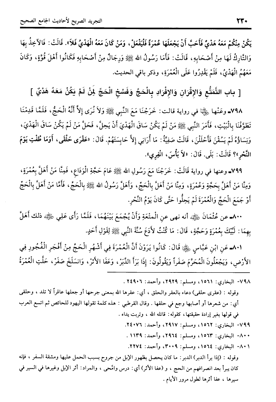 798 - وَعَنْهَا - رضي الله عنها - فِيْ رِوَايَةٍ قَالَتْ: خَرَجْنَا مَعَ النَّبِيِّ - صلى الله عليه وسلم - وَلا نُرَى إِلَّا أَنَّهُ الْحَجُّ، فَلَمَّا قَدِمْنَا تَطَوَّفْنَا بِالْبَيْتِ، فَأَمَرَ النَّبِيُّ - صلى الله عليه وسلم - مَنْ لَمْ يَكُنْ سَاقَ الْهَدْيَ أَنْ يَحِلَّ، فَحَلَّ مَنْ لَمْ يَكُنْ سَاقَ الْهَدْيَ، وَنِسَاؤُهُ لَمْ يَسُقْنَ فَأَحْلَلْنَ، قَالَتْ صَفِيَّةُ: مَا أُرَانِي إِلَّا حَابِسَتَهُمْ قَالَ: «عَقْرَى حَلْقَى أَوَمَا طُفْتِ يَوْمَ النَّحْرِ»؟ قَالَتْ: قُلْتُ: بَلَى قَالَ: «لا بَأْسَ انْفِرِي». (بخاري: 1561)