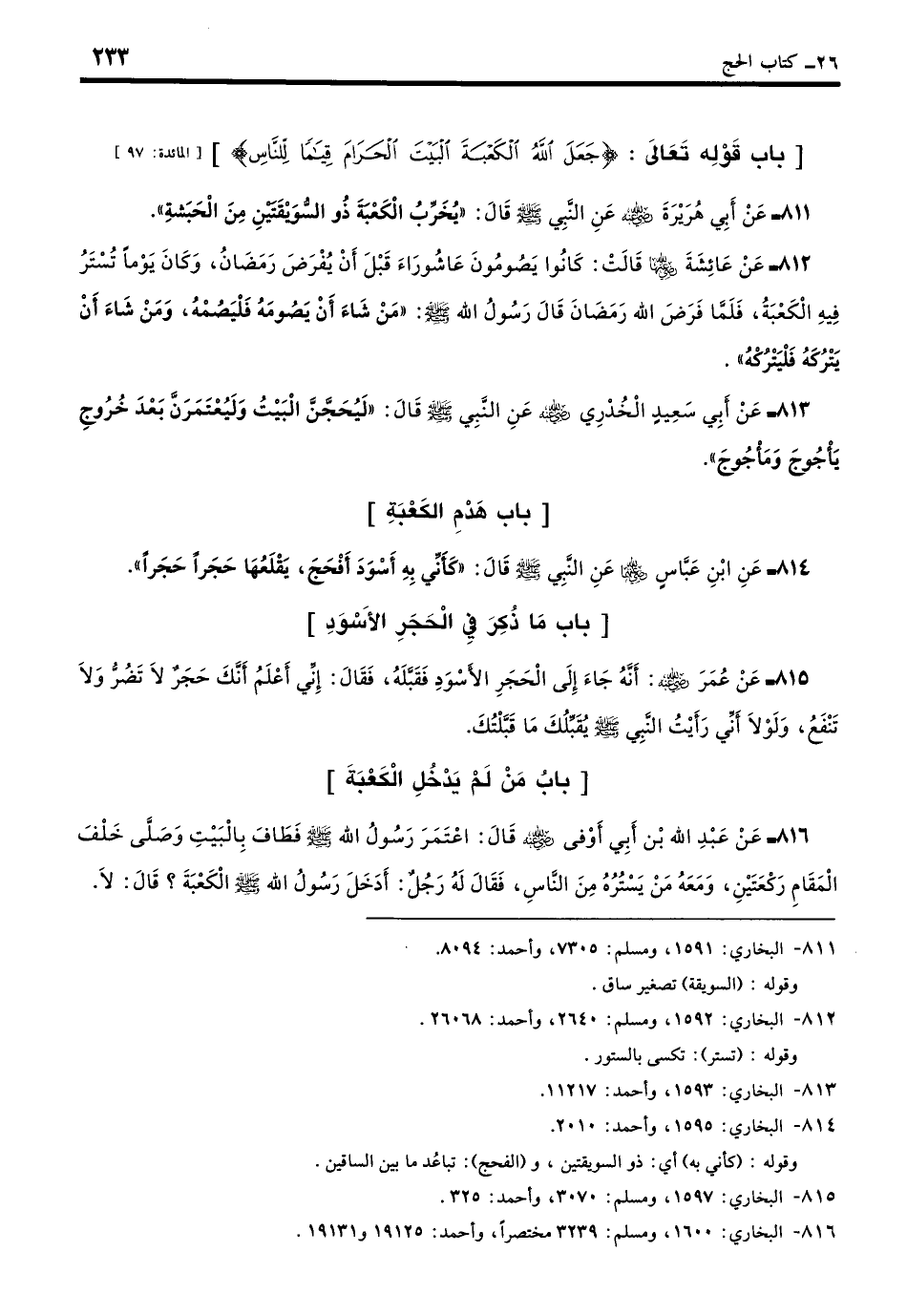 811 - عَنْ أَبِي هُرَيْرَةَ - رضي الله عنه - عَنِ النَّبِيِّ - صلى الله عليه وسلم - قَالَ: «يُخَرِّبُ الْكَعْبَةَ ذُو السُّوَيْقَتَيْنِ مِنَ الْحَبَشَةِ». (بخاري: 1591)