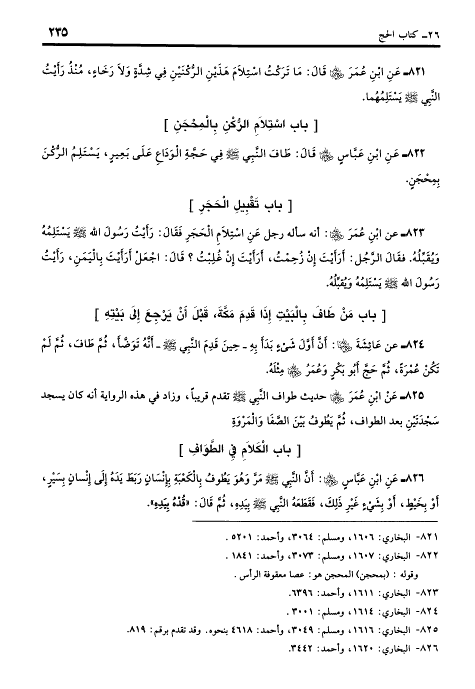 821 - عَنِ ابْنِ عُمَرَ - رضي الله عنهما - قَالَ: مَا تَرَكْتُ اسْتِلامَ هَذَيْنِ الرُّكْنَيْنِ فِي شِدَّةٍ وَلا رَخَاءٍ مُنْذُ رَأَيْتُ النَّبِيَّ - صلى الله عليه وسلم - يَسْتَلِمُهُمَا. (بخاري: 1606)