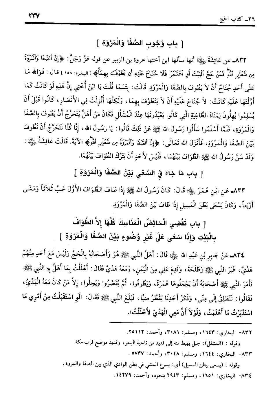 832 - عَنْ عَائِشَةَ - رضي الله عنها -: أَنَّهَا سَأَلَهَا ابْنُ أُخْتِهَا عُرَوَةُ بْنُ الزُّبَيْرِ - رضي الله عنه - عَنْ قَوْلِ اللَّهِ تَعَالَى: {إِنَّ الصَّفَا وَالْمَرْوَةَ مِنْ شَعَائِرِ اللَّهِ فَمَنْ حَجَّ الْبَيْتَ أَوِ اعْتَمَرَ فَلا جُنَاحَ عَلَيْهِ أَنْ يَطَّوَّفَ بِهِمَا}. قَالَ: فَوَاللَّهِ مَا عَلَى أَحَدٍ جُنَاحٌ أَنْ لا يَطُوفَ بِالصَّفَا وَالْمَرْوَةِ، قَالَتْ: بِئْسَ مَا قُلْتَ يَا ابْنَ أُخْتِي، إِنَّ هَذِهِ لَوْ كَانَتْ كَمَا أَوَّلْتَهَا عَلَيْهِ كَانَتْ لا جُنَاحَ عَلَيْهِ أَنْ لا يَتَطَوَّفَ بِهِمَا، وَلَكِنَّهَا أُنْزِلَتْ فِي الأَنْصَارِ، كَانُوا قَبْلَ أَنْ يُسْلِمُوا يُهِلُّونَ لِمَنَاةَ الطَّاغِيَةِ الَّتِي كَانُوا يَعْبُدُونَهَا عِنْدَ الْمُشَلَّلِ، فَكَانَ مَنْ أَهَلَّ يَتَحَرَّجُ أَنْ يَطُوفَ بِالصَّفَا وَالْمَرْوَةِ، فَلَمَّا أَسْلَمُوا سَأَلُوا رَسُولَ اللَّهِ - صلى الله عليه وسلم - عَنْ ذَلِكَ، قَالُوا: يَا رَسُولَ اللَّهِ، إِنَّا كُنَّا نَتَحَرَّجُ أَنْ نَطُوفَ بَيْنَ الصَّفَا وَالْمَرْوَةِ، فَأَنْزَلَ اللَّهُ تَعَالَى: {إِنَّ الصَّفَا وَالْمَرْوَةَ مِنْ شَعَائِرِ اللَّهِ} الآيَةَ. قَالَتْ عَائِشَةُ - رضي الله عنها -: وَقَدْ سَنَّ رَسُولُ اللَّهِ - صلى الله عليه وسلم - الطَّوَافَ بَيْنَهُمَا، فَلَيْسَ لأَحَدٍ أَنْ يَتْرُكَ الطَّوَافَ بَيْنَهُمَا. (بخاري: 1643)