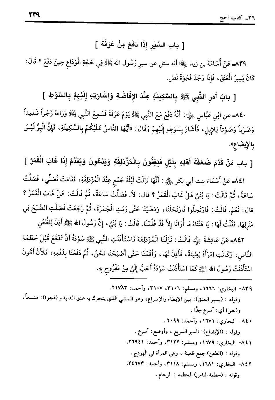 839 - عَنْ أُسَامَةَ بْنِ زَيْدٍ - رضي الله عنهما -: أَنَّهُ سُئِلَ عن سِيرِ رَسُولُ اللَّهِ - صلى الله عليه وسلم - فِي حَجَّةِ الْوَدَاعِ حِينَ دَفَعَ قَالَ: كَانَ يَسِيرُ الْعَنَقَ، فَإِذَا وَجَدَ فَجْوَةً نَصَّ. (بخاري: 1666)