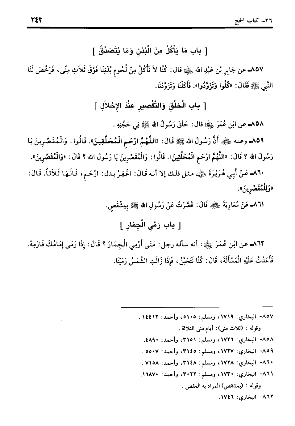 861 - عَنْ مُعَاوِيَةَ - رضي الله عنه - قَالَ: قَصَّرْتُ عَنْ رَسُولِ اللَّهِ - صلى الله عليه وسلم - بِمِشْقَصٍ. (بخاري: 1730)