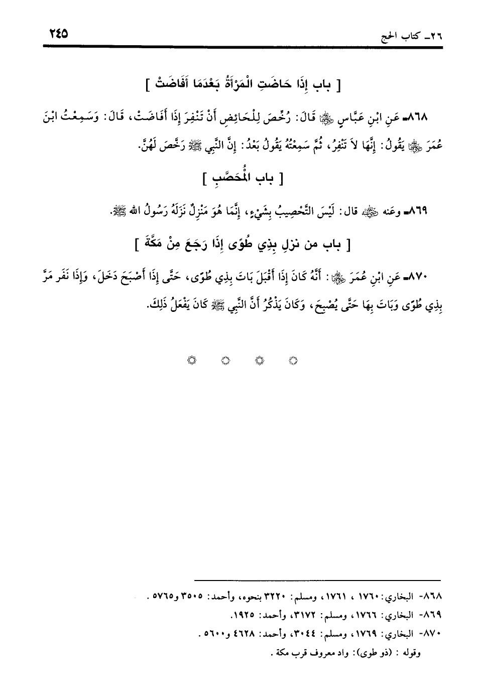 870 - عَنِ ابْنِ عُمَرَ - رضي الله عنهما - أَنَّهُ كَانَ إِذَا أَقْبَلَ بَاتَ بِذِي طُوًى حَتَّى إِذَا أَصْبَحَ دَخَلَ، وَإِذَا نَفَرَ مَرَّ بِذِي طُوًى وَبَاتَ بِهَا حَتَّى يُصْبِحَ، وَكَانَ يَذْكُرُ أَنَّ النَّبِيَّ - صلى الله عليه وسلم - كَانَ يَفْعَلُ ذَلِكَ. (بخاري: 1769)