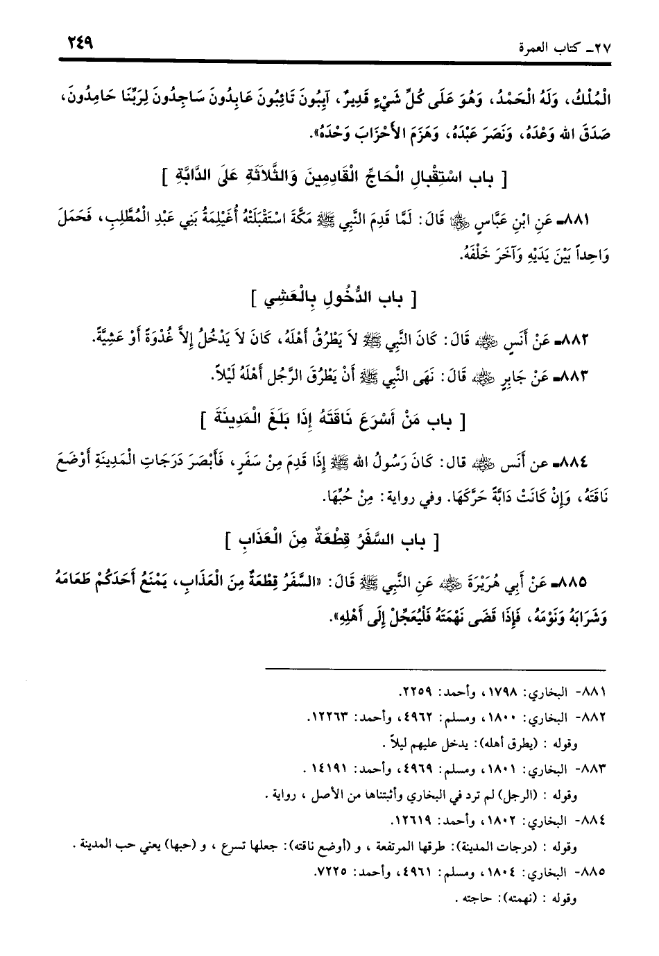885 - عَنْ أَبِي هُرَيْرَةَ - رضي الله عنه - عَنِ النَّبِيِّ - صلى الله عليه وسلم - قَالَ: «السَّفَرُ قِطْعَةٌ مِنَ الْعَذَابِ يَمْنَعُ أَحَدَكُمْ طَعَامَهُ وَشَرَابَهُ وَنَوْمَهُ، فَإِذَا قَضَى نَهْمَتَهُ فَلْيُعَجِّلْ إِلَى أَهْلِهِ». (بخاري: 1804)