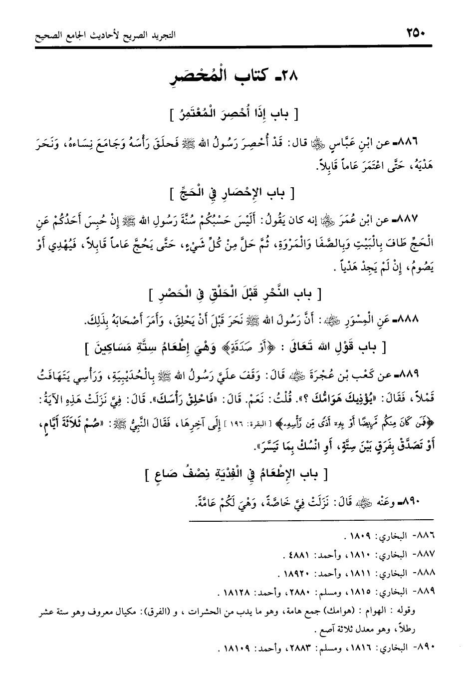889 - عن كَعْب بْنَ عُجْرَةَ - رضي الله عنه - قَالَ: وَقَفَ عَلَيَّ رَسُولُ اللَّهِ - صلى الله عليه وسلم - بِالْحُدَيْبِيَةِ وَرَأْسِي يَتَهَافَتُ قَمْلًا فَقَالَ: «يُؤْذِيكَ هَوَامُّكَ؟» قُلْتُ: نَعَمْ، قَالَ: «فَاحْلِقْ رَأْسَكَ - أَوْ قَالَ: احْلِقْ» قَالَ: فِيَّ نَزَلَتْ هَذِهِ الآيَة: {فَمَنْ كَانَ مِنْكُمْ مَرِيضًا أَوْ بِهِ أَذًى مِنْ رَأْسِهِ} إِلَى آخِرِهَا، فَقَالَ النَّبِيُّ - صلى الله عليه وسلم -: «صُمْ ثَلاثَةَ أَيَّامٍ أَوْ تَصَدَّقْ بِفَرَقٍ بَيْنَ سِتَّةٍ أَوِ انْسُكْ بِمَا تَيَسَّرَ». (بخاري: 1815)