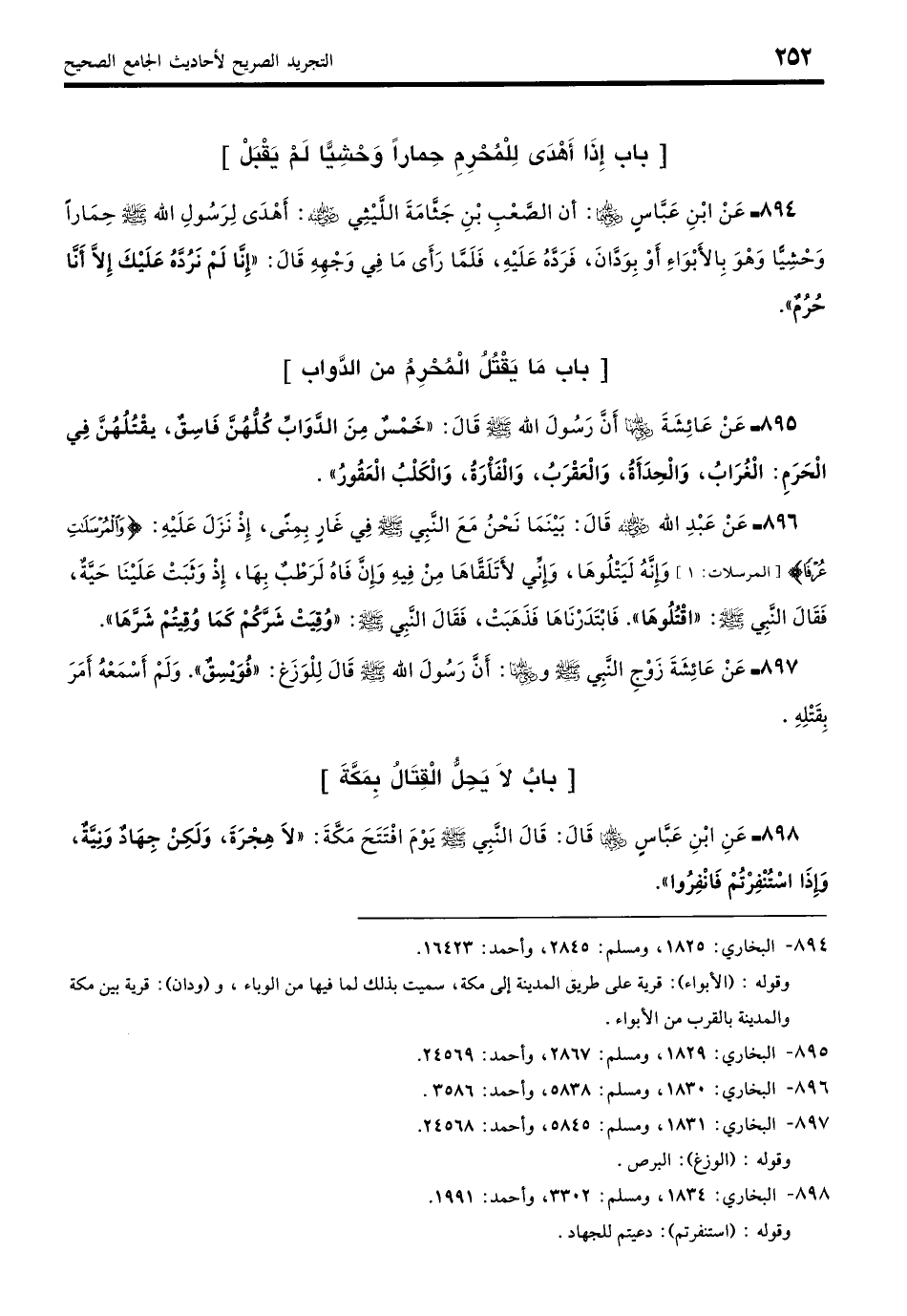 894 - عَنْ عَبْدِ اللَّهِ بنِ عَبَّاسٍ - رضي الله عنهما - عَنِ الصَّعْبِ بْنِ جَثَّامَةَ اللَّيْثِيِّ - رضي الله عنه - أَنَّهُ أَهْدَى لِرَسُولِ اللَّهِ - صلى الله عليه وسلم - حِمَارًا وَحْشِيًّا وَهُوَ بِالأَبْوَاءِ أَوْ بِوَدَّانَ فَرَدَّهُ عَلَيْهِ، فَلَمَّا رَأَى مَا فِي وَجْهِهِ قَالَ: «إِنَّا لَمْ نَرُدَّهُ عَلَيْكَ إِلَّا أَنَّا حُرُمٌ». (بخاري: 1825)