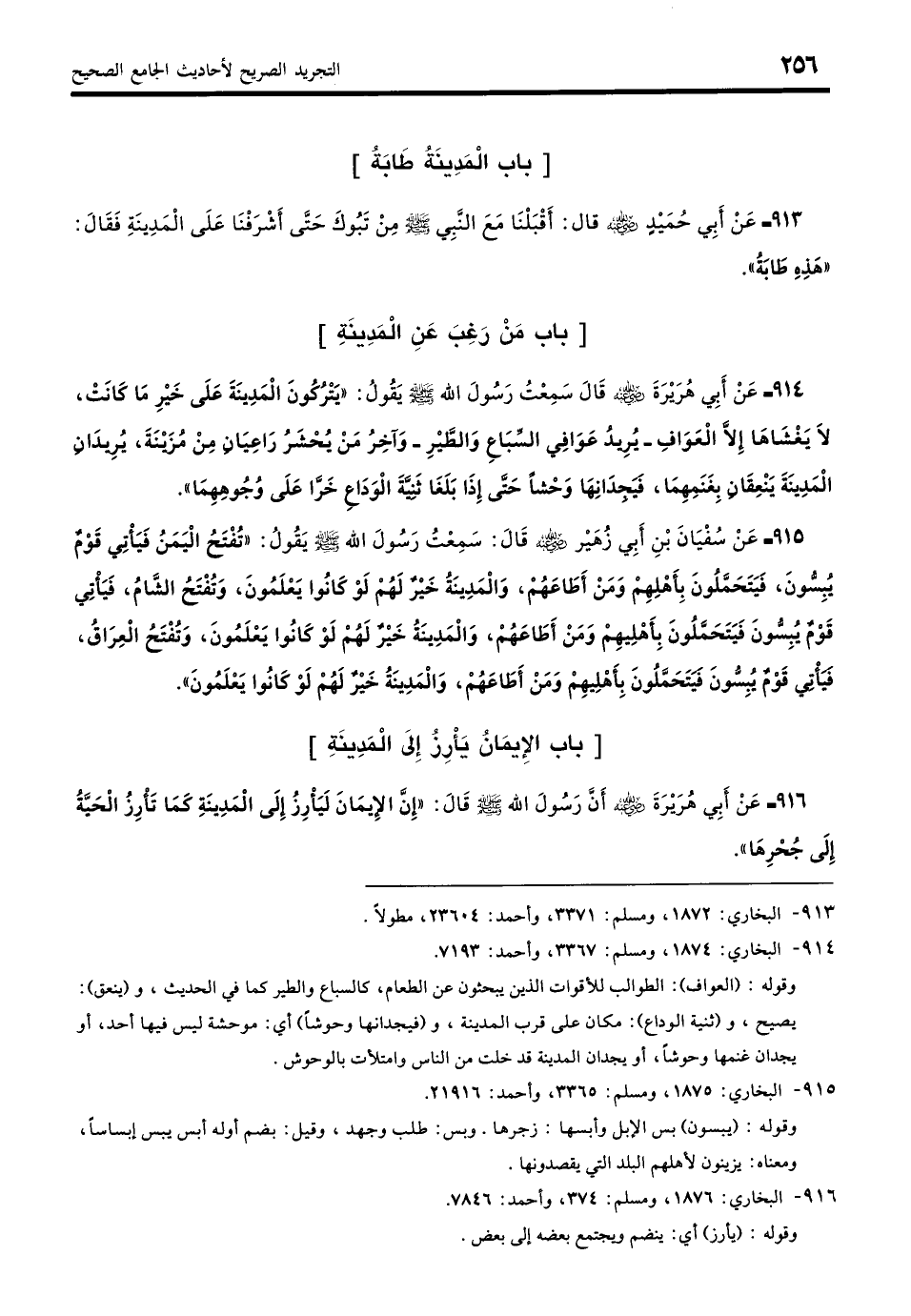 916 - عَنْ أَبِي هُرَيْرَةَ - رضي الله عنه -: أَنَّ رَسُولَ اللَّهِ - صلى الله عليه وسلم - قَالَ: «إِنَّ الإِيمَانَ لَيَأْرِزُ إِلَى الْمَدِينَةِ كَمَا تَأْرِزُ الْحَيَّةُ إِلَى جُحْرِهَا». (بخاري: 1876)