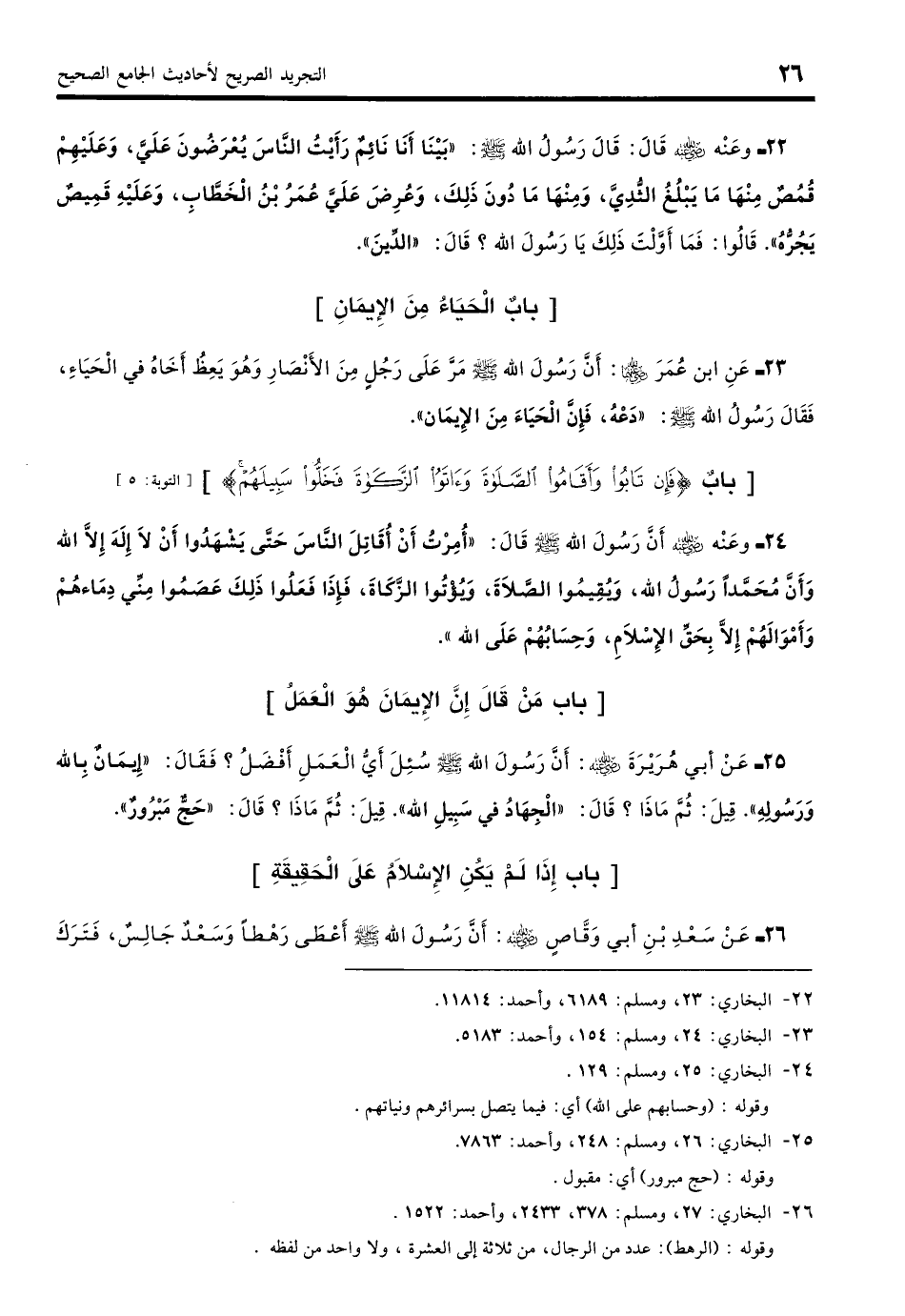 26 - عن سَعْدِ بْنِ أَبِي وَقَّاصٍ - رضي الله عنه -: أَنَّ رَسُولَ اللَّهِ - صلى الله عليه وسلم - أَعْطَى رَهْطًا وَسَعْدٌ جَالِسٌ، فَتَرَكَ