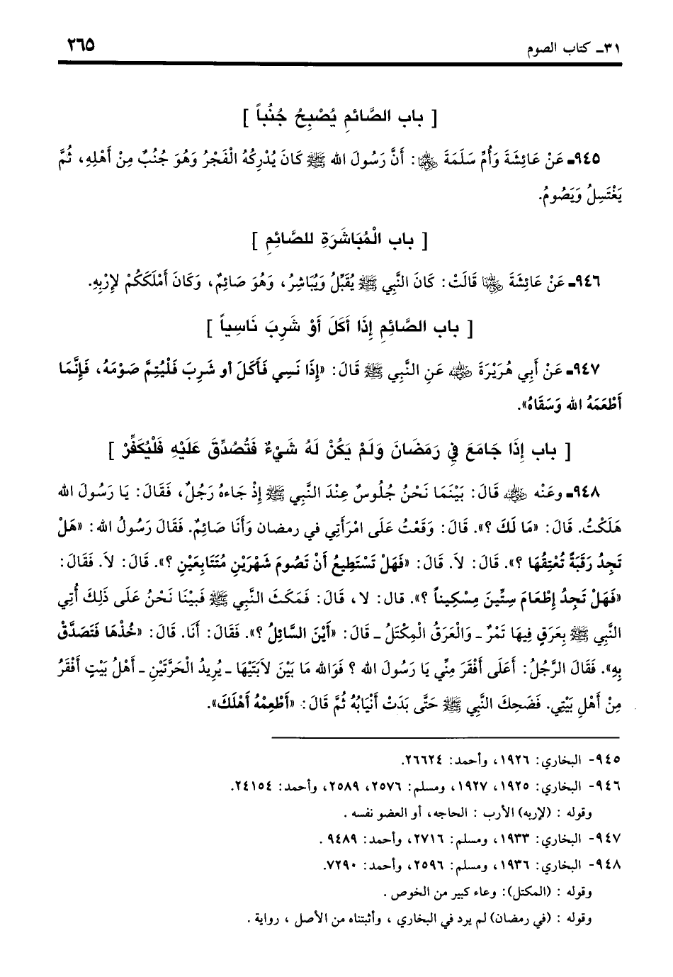 948 - عَنِ أبي هُرَيْرَةَ - رضي الله عنه - قَالَ: بَيْنَمَا نَحْنُ جُلُوسٌ عِنْدَ النَّبِيِّ - صلى الله عليه وسلم - إِذْ جَاءَهُ رَجُلٌ فَقَالَ: يَا رَسُولَ اللَّهِ هَلَكْتُ، قَالَ: «مَا لَكَ؟» قَالَ: وَقَعْتُ عَلَى امْرَأَتِي وَأَنَا صَائِمٌ، فَقَالَ رَسُولُ اللَّهِ - صلى الله عليه وسلم -: «هَلْ تَجِدُ رَقَبَةً تُعْتِقُهَا؟» قَالَ: لا، قَالَ: «فَهَلْ تَسْتَطِيعُ أَنْ تَصُومَ شَهْرَيْنِ مُتَتَابِعَيْنِ؟» قَالَ: لا، فَقَالَ: «فَهَلْ تَجِدُ إِطْعَامَ سِتِّينَ مِسْكِينًا؟» قَالَ: لا، قَالَ: فَمَكَثَ النَّبِيُّ - صلى الله عليه وسلم - فَبَيْنَا نَحْنُ عَلَى ذَلِكَ أُتِيَ النَّبِيُّ - صلى الله عليه وسلم - بِعَرَقٍ فِيهَا تَمْرٌ وَالْعَرَقُ الْمِكْتَلُ قَالَ: «أَيْنَ السَّائِلُ؟» فَقَالَ: أَنَا، قَالَ: «خُذْهَا فَتَصَدَّقْ بِهِ» فَقَالَ الرَّجُلُ: أَعَلَى أَفْقَرَ مِنِّي يَا رَسُولَ اللَّهِ؟ فَوَاللَّهِ مَا بَيْنَ لابَتَيْهَا -يُرِيدُ الْحَرَّتَيْنِ- أَهْلُ بَيْتٍ أَفْقَرُ مِنْ أَهْلِ بَيْتِي، فَضَحِكَ النَّبِيُّ - صلى الله عليه وسلم - حَتَّى بَدَتْ أَنْيَابُهُ ثُمَّ قَالَ: «أَطْعِمْهُ أَهْلَكَ».