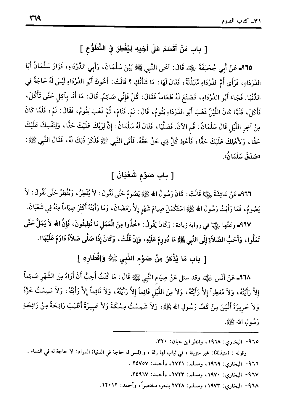 965 - عَنْ أَبِي جُحَيْفَةَ - رضي الله عنه - قَالَ: آخَى النَّبِيُّ - صلى الله عليه وسلم - بَيْنَ سَلْمَانَ وَأَبِي الدَّرْدَاءِ، فَزَارَ سَلْمَانُ أَبَا الدَّرْدَاءِ فَرَأَى أُمَّ الدَّرْدَاءِ مُتَبَذِّلَةً فَقَالَ لَهَا: مَا شَأْنُكِ؟ قَالَتْ: أَخُوكَ أَبُو الدَّرْدَاءِ لَيْسَ لَهُ حَاجَةٌ فِي الدُّنْيَا، فَجَاءَ أَبُو الدَّرْدَاءِ فَصَنَعَ لَهُ طَعَامًا فَقَالَ: كُلْ، قَالَ: فَإِنِّي صَائِمٌ، قَالَ: مَا أَنَا بِآكِلٍ حَتَّى تَأْكُلَ، قَالَ: فَأَكَلَ، فَلَمَّا كَانَ اللَّيْلُ ذَهَبَ أَبُو الدَّرْدَاءِ يَقُومُ، قَالَ: نَمْ، فَنَامَ، ثُمَّ ذَهَبَ يَقُومُ فَقَالَ: نَمْ، فَلَمَّا كَانَ مِنْ آخِرِ اللَّيْلِ قَالَ سَلْمَانُ: قُمِ الآنَ، فَصَلَّيَا، فَقَالَ لَهُ سَلْمَانُ: إِنَّ لِرَبِّكَ عَلَيْكَ حَقًّا وَلِنَفْسِكَ عَلَيْكَ حَقًّا وَلأَهْلِكَ عَلَيْكَ حَقًّا، فَأَعْطِ كُلَّ ذِي حَقٍّ حَقَّهُ، فَأَتَى النَّبِيَّ - صلى الله عليه وسلم - فَذَكَرَ ذَلِكَ لَهُ فَقَالَ النَّبِيُّ - صلى الله عليه وسلم -: «صَدَقَ سَلْمَانُ». (بخاري: 1968)