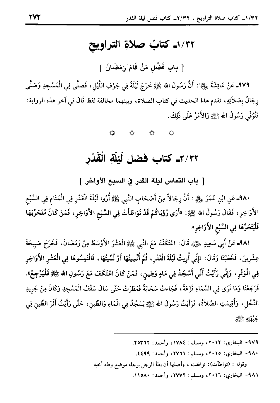 980 - عَنِ ابْنِ عُمَرَ - رضي الله عنهما - أَنَّ رِجَالًا مِنْ أَصْحَابِ النَّبِيِّ - صلى الله عليه وسلم - أُرُوا لَيْلَةَ الْقَدْرِ فِي الْمَنَامِ فِي السَّبْعِ الأَوَاخِرِ فَقَالَ رَسُولُ اللَّهِ - صلى الله عليه وسلم -: «أَرَى رُؤْيَاكُمْ قَدْ تَوَاطَأَتْ فِي السَّبْعِ الأَوَاخِرِ فَمَنْ كَانَ مُتَحَرِّيهَا فَلْيَتَحَرَّهَا فِي السَّبْعِ الأَوَاخِرِ». (بخاري: 2015)