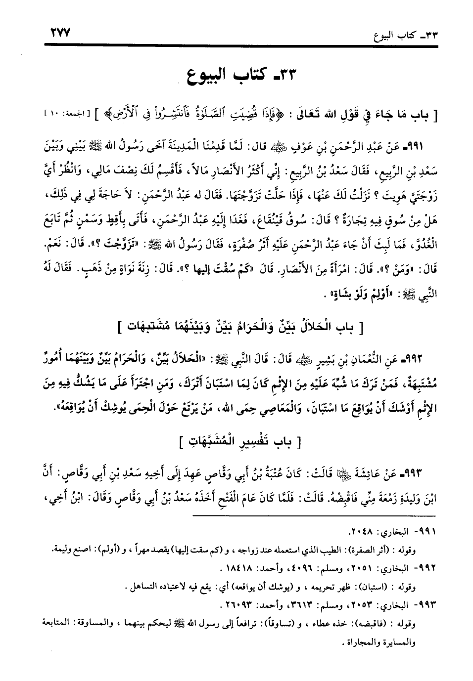 992 - عَنِ النُّعْمَانِ بْنِ بَشِيرٍ - رضي الله عنه - قَالَ: قَالَ النَّبِيُّ - صلى الله عليه وسلم -: «الْحَلالُ بَيِّنٌ وَالْحَرَامُ بَيِّنٌ وَبَيْنَهُمَا أُمُورٌ مُشْتَبِهَةٌ، فَمَنْ تَرَكَ مَا شُبِّهَ عَلَيْهِ مِنَ الإِثْمِ كَانَ لِمَا اسْتَبَانَ أَتْرَكَ، وَمَنِ اجْتَرَأَ عَلَى مَا يَشُكُّ فِيهِ مِنَ الإِثْمِ أَوْشَكَ أَنْ يُوَاقِعَ مَا اسْتَبَانَ، وَالْمَعَاصِي حِمَى اللَّهِ، مَنْ يَرْتَعْ حَوْلَ الْحِمَى يُوشِكُ أَنْ يُوَاقِعَهُ». (بخاري: 2051)