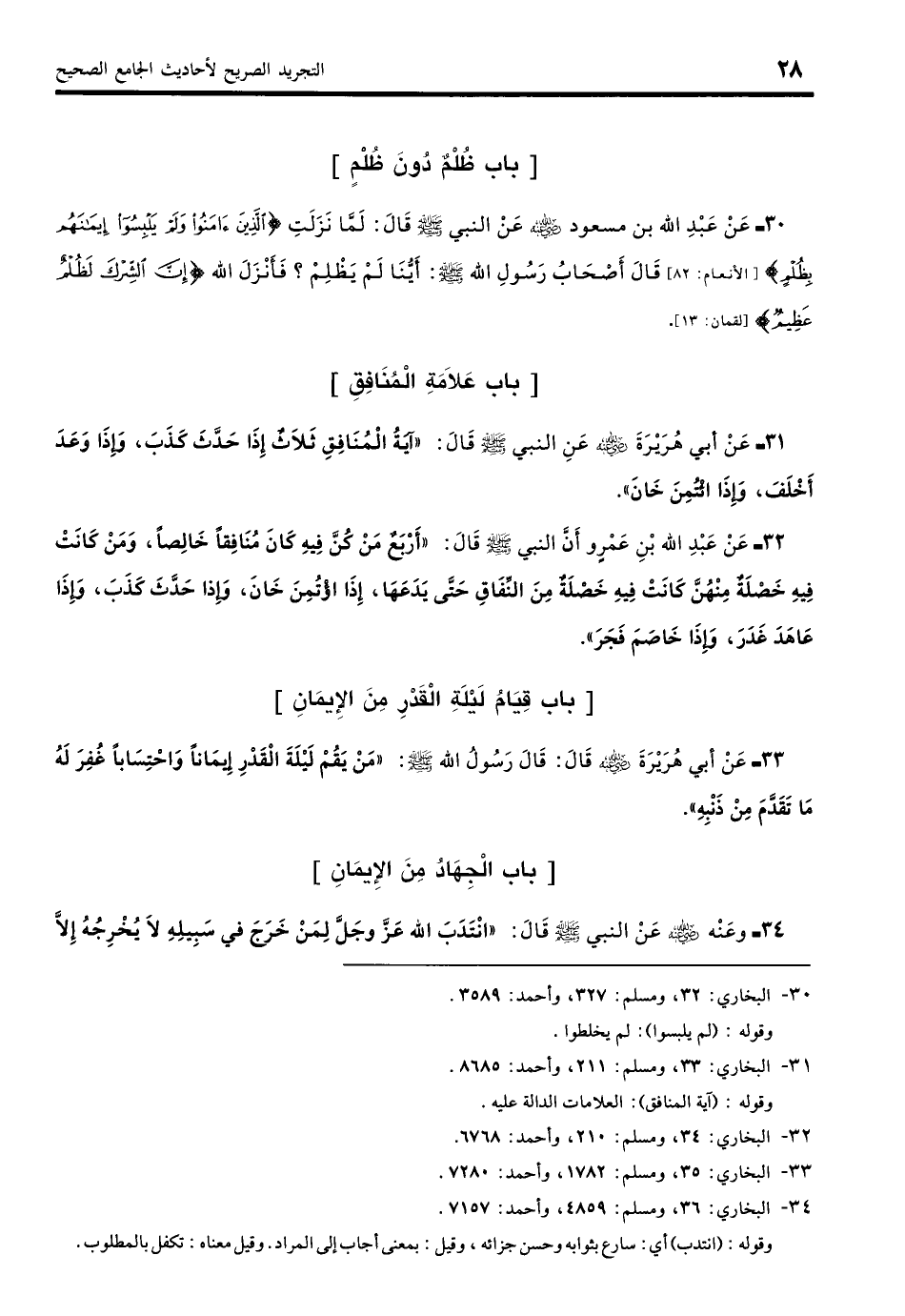 30 - عَنْ عَبْدِ اللَّهِ بْنِ مَسْعُودٍ - رضي الله عنه - قَالَ: لَمَّا نَزَلَتْ: {الَّذِينَ آمَنُوا وَلَمْ يَلْبِسُوا إِيمَانَهُمْ بِظُلْمٍ}، قَالَ أَصْحَابُ رَسُولِ اللَّهِ - صلى الله عليه وسلم -: أَيُّنَا لَمْ يَظْلِمْ؟ فَأَنْزَلَ اللَّهُ عَزَّ وَجَلَّ: {إِنَّ الشِّرْكَ لَظُلْمٌ عَظِيمٌ}. (بخاري: 32)