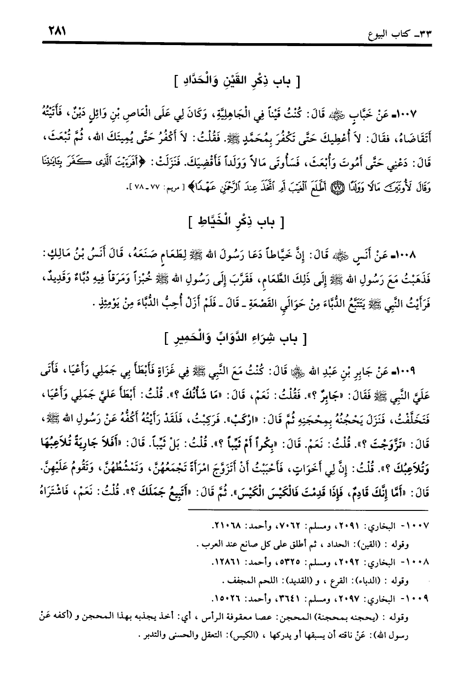 1009 - عَنْ جَابِرِ بْنِ عَبْدِ اللَّهِ - رضي الله عنهما - قَالَ: كُنْتُ مَعَ النَّبِيِّ - صلى الله عليه وسلم - فِي غَزَاةٍ فَأَبْطَأَ بِي جَمَلِي وَأَعْيَا، فَأَتَى عَلَيَّ النَّبِيُّ - صلى الله عليه وسلم - فَقَالَ: «جَابِرٌ»؟ فَقُلْتُ: نَعَمْ، قَالَ: «مَا شَأْنُكَ»؟ قُلْتُ: أَبْطَأَ عَلَيَّ جَمَلِي وَأَعْيَا فَتَخَلَّفْتُ، فَنَزَلَ يَحْجُنُهُ بِمِحْجَنِهِ، ثُمَّ قَالَ: «ارْكَبْ» فَرَكِبْتُ فَلَقَدْ رَأَيْتُهُ أَكُفُّهُ عَنْ رَسُولِ اللَّهِ - صلى الله عليه وسلم -، قَالَ: «تَزَوَّجْتَ»؟ قُلْتُ: نَعَمْ. قَالَ: «بِكْرًا أَمْ ثَيِّبًا»؟ قُلْتُ: بَلْ ثَيِّبًا، قَالَ: «أَفَلا جَارِيَةً تُلاعِبُهَا وَتُلاعِبُكَ»؟ قُلْتُ: إِنَّ لِي أَخَوَاتٍ فَأَحْبَبْتُ أَنْ أَتَزَوَّجَ امْرَأَةً تَجْمَعُهُنَّ وَتَمْشُطُهُنَّ وَتَقُومُ عَلَيْهِنَّ، قَالَ: «أَمَّا إِنَّكَ قَادِمٌ فَإِذَا قَدِمْتَ فَالْكَيْسَ الْكَيْسَ» ثُمَّ قَالَ: «أَتَبِيعُ جَمَلَكَ»؟ قُلْتُ: نَعَمْ، فَاشْتَرَاهُ