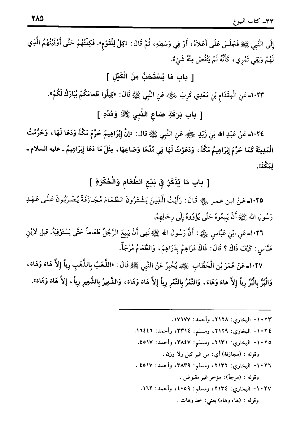 1023 - عَنِ الْمِقْدَامِ بْنِ مَعْدِي كَرِبَ - رضي الله عنه - عَنِ النَّبِيِّ - صلى الله عليه وسلم - قَالَ: «كِيلُوا طَعَامَكُمْ يُبَارَكْ لَكُمْ». (بخاري: 2128)