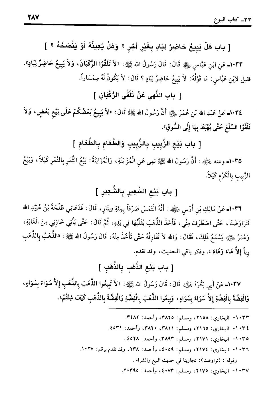 1036 - عَنْ مَالِكِ بْنِ أَوْسٍ - رضي الله عنه -: أَنَّهُ الْتَمَسَ صَرْفًا بِمِائَةِ دِينَارٍ، فَدَعَانِي طَلْحَةُ بْنُ عُبَيْدِاللَّهِ فَتَرَاوَضْنَا حَتَّى اصْطَرَفَ مِنِّي، فَأَخَذَ الذَّهَبَ يُقَلِّبُهَا فِي يَدِهِ ثُمَّ قَالَ: حَتَّى يَأْتِيَ خَازِنِي مِنَ الْغَابَةِ وَعُمَرُ يَسْمَعُ ذَلِكَ فَقَالَ: وَاللَّهِ لا تُفَارِقُهُ حَتَّى تَأْخُذَ مِنْهُ، قَالَ رَسُولُ اللَّهِ - صلى الله عليه وسلم -: «الذَّهَبُ بِالذَّهَبِ رِبًا إِلَّا هَاءَ وَهَاءَ» وذكر باقي الحديث وقد تقدم. (بخاري: 2174)