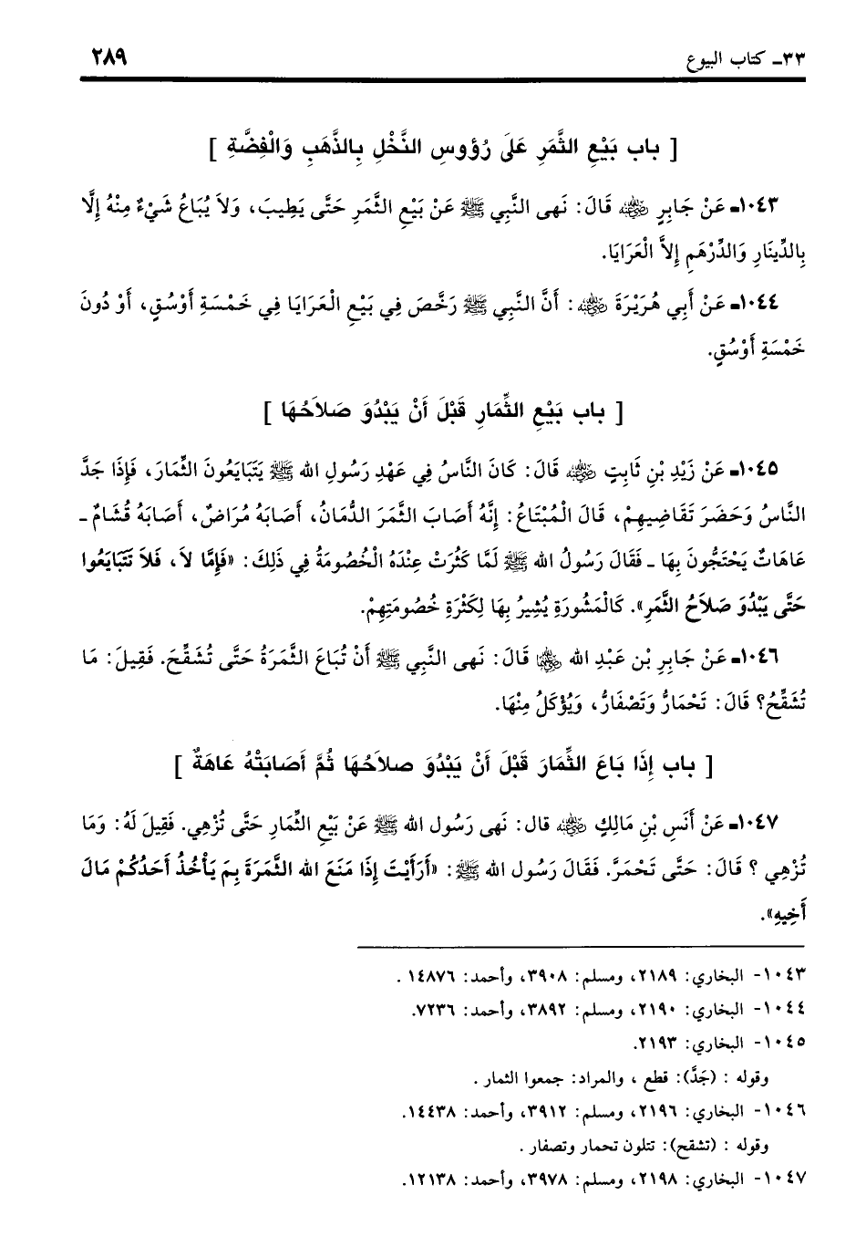 1043 - عَنْ جَابِرٍ - رضي الله عنه - قَالَ: نَهَى النَّبِيُّ - صلى الله عليه وسلم - عَنْ بَيْعِ الثَّمَرِ حَتَّى يَطِيبَ وَلا يُبَاعُ شَيْءٌ مِنْهُ إِلَّا بِالدِّينَارِ وَالدِّرْهَمِ إِلَّا الْعَرَايَا. (بخاري: 2189)