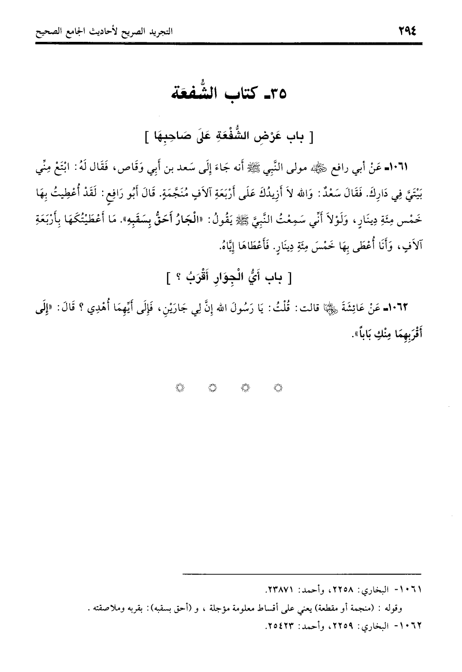 1061 - عَنْ أَبي رَافِعٍ - رضي الله عنه - مَوْلَى النَّبِيِّ - صلى الله عليه وسلم - أنَّهُ جَاءَ إِلَى سَعْدِ بْنِ أَبِي وَقَّاصٍ فَقَالَ لَهُ: ابْتَعْ مِنِّي بَيْتَيَّ فِي دَارِكَ، فَقَالَ سَعْدٌ: وَاللَّهِ لا أَزِيدُكَ عَلَى أَرْبَعَةِ آلافٍ مُنَجَّمَةً أَوْ مُقَطَّعَةً قَالَ أَبُو رَافِعٍ: لَقَدْ أُعْطِيتُ بِهَا خَمْسَ مِائَةِ دِينَارٍ وَلَوْلا أَنِّي سَمِعْتُ النَّبِيَّ - صلى الله عليه وسلم - يَقُولُ: «الْجَارُ أَحَقُّ بِسَقَبِهِ» مَا أَعْطَيْتُكَهَا بِأَرْبَعَةِ آلافٍ وَأَنَا أُعْطَى بِهَا خَمْسَ مِائَةِ دِينَارٍ، فَأَعْطَاهَا إِيَّاهُ. (بخاري: 2258)