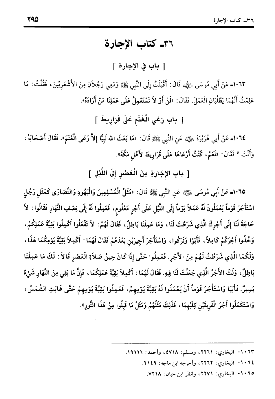 1065 - عَنْ أَبِي مُوسَى - رضي الله عنه - عَنِ النَّبِيِّ - صلى الله عليه وسلم - قَالَ: «مَثَلُ الْمُسْلِمِينَ وَالْيَهُودِ وَالنَّصَارَى كَمَثَلِ رَجُلٍ اسْتَأْجَرَ قَوْمًا يَعْمَلُونَ لَهُ عَمَلًا يَوْمًا إِلَى اللَّيْلِ عَلَى أَجْرٍ مَعْلُومٍ، فَعَمِلُوا لَهُ إِلَى نِصْفِ النَّهَارِ فَقَالُوا: لا حَاجَةَ لَنَا إِلَى أَجْرِكَ الَّذِي شَرَطْتَ لَنَا وَمَا عَمِلْنَا بَاطِلٌ، فَقَالَ لَهُمْ: لا تَفْعَلُوا أَكْمِلُوا بَقِيَّةَ عَمَلِكُمْ وَخُذُوا أَجْرَكُمْ كَامِلًا، فَأَبَوْا وَتَرَكُوا، وَاسْتَأْجَرَ أَجِيرَيْنِ بَعْدَهُمْ فَقَالَ لَهُمَا: أَكْمِلا بَقِيَّةَ يَوْمِكُمَا هَذَا وَلَكُمَا الَّذِي شَرَطْتُ لَهُمْ مِنَ الأَجْرِ، فَعَمِلُوا حَتَّى إِذَا كَانَ حِينُ صَلاةِ الْعَصْرِ قَالا: لَكَ مَا عَمِلْنَا بَاطِلٌ وَلَكَ الأَجْرُ الَّذِي جَعَلْتَ لَنَا فِيهِ، فَقَالَ لَهُمَا: أَكْمِلا بَقِيَّةَ عَمَلِكُمَا، مَا بَقِيَ مِنَ النَّهَارِ شَيْءٌ يَسِيرٌ، فَأَبَيَا، وَاسْتَأْجَرَ قَوْمًا أَنْ يَعْمَلُوا لَهُ بَقِيَّةَ يَوْمِهِمْ، فَعَمِلُوا بَقِيَّةَ يَوْمِهِمْ حَتَّى غَابَتِ الشَّمْسُ وَاسْتَكْمَلُوا أَجْرَ الْفَرِيقَيْنِ كِلَيْهِمَا، فَذَلِكَ مَثَلُهُمْ وَمَثَلُ مَا قَبِلُوا مِنْ هَذَا النُّورِ». (بخاري: 2271)