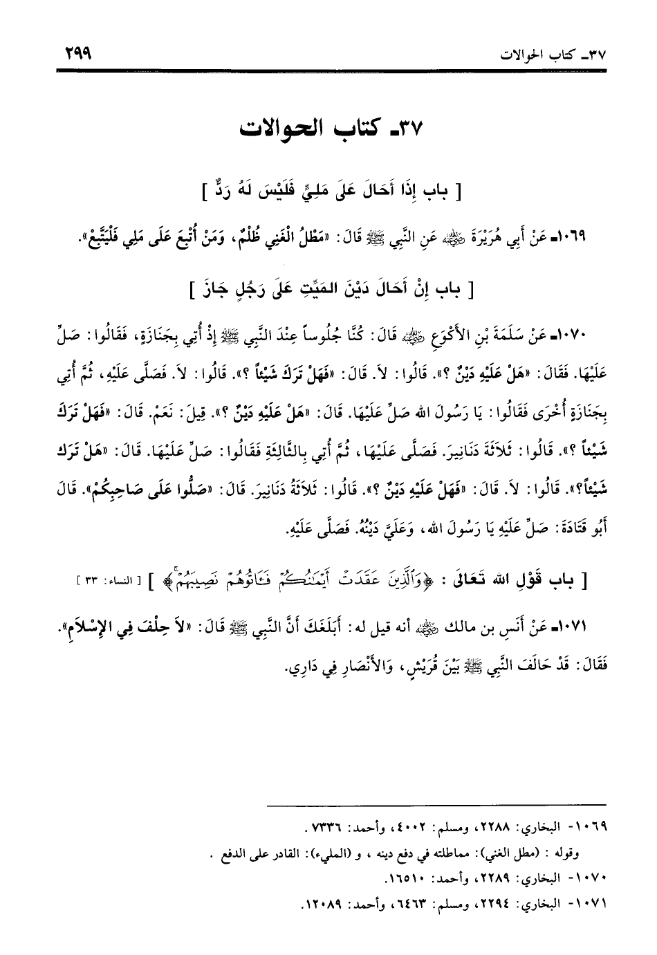 1069 - عَنْ أَبِي هُرَيْرَةَ - رضي الله عنه - عَنِ النَّبِيِّ - صلى الله عليه وسلم - قَالَ: «مَطْلُ الْغَنِيِّ ظُلْمٌ، وَمَنْ أُتْبِعَ عَلَى مَلِيٍّ فَلْيَتَّبِعْ». (بخاري: 2288)