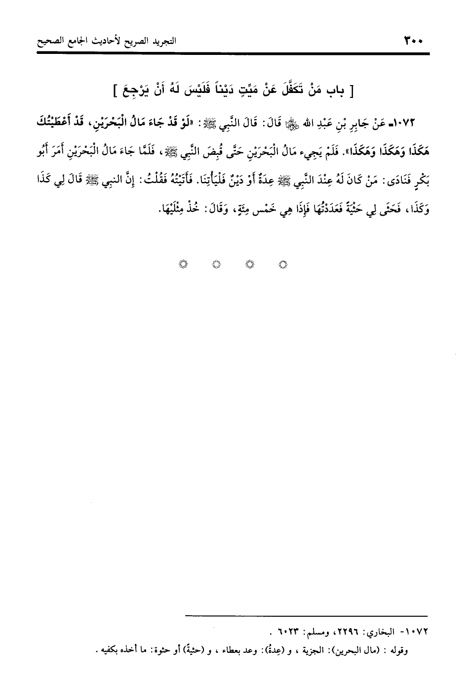 1072 - عَنْ جَابِرِ بْنِ عَبْدِ اللَّهِ - رضي الله عنهما - قَالَ: قَالَ النَّبِيُّ - صلى الله عليه وسلم -: «لَوْ قَدْ جَاءَ مَالُ الْبَحْرَيْنِ قَدْ أَعْطَيْتُكَ هَكَذَا وَهَكَذَا وَهَكَذَا» فَلَمْ يَجِئْ مَالُ الْبَحْرَيْنِ حَتَّى قُبِضَ النَّبِيُّ - صلى الله عليه وسلم -، فَلَمَّا جَاءَ مَالُ الْبَحْرَيْنِ أَمَرَ أَبُو بَكْرٍ فَنَادَى: مَنْ كَانَ لَهُ عِنْدَ النَّبِيِّ - صلى الله عليه وسلم - عِدَةٌ أَوْ دَيْنٌ فَلْيَأْتِنَا، فَأَتَيْتُهُ فَقُلْتُ: إِنَّ النَّبِيَّ - صلى الله عليه وسلم - قَالَ: لِي كَذَا وَكَذَا فَحَثَى لِي حَثْيَةً، فَعَدَدْتُهَا فَإِذَا هِيَ خَمْسُ مِائَةٍ وَقَالَ: خُذْ مِثْلَيْهَا. (بخاري: 2296)