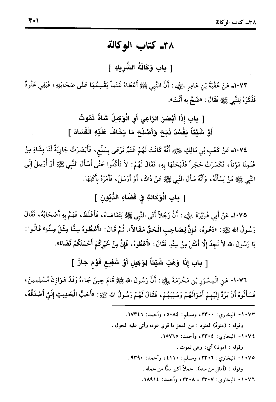 1074 - عَنْ كَعْبِ بْنِ مَالِكٍ - رضي الله عنه - أَنَّهُ كَانَتْ لَهُمْ غَنَمٌ تَرْعَى بِسَلْعٍ فَأَبْصَرَتْ جَارِيَةٌ لَنَا بِشَاةٍ مِنْ غَنَمِنَا مَوْتًا فَكَسَرَتْ حَجَرًا فَذَبَحَتْهَا بِهِ، فَقَالَ لَهُمْ: لا تَأْكُلُوا حَتَّى أَسْأَلَ النَّبِيَّ - صلى الله عليه وسلم - أَوْ أُرْسِلَ إِلَى النَّبِيِّ - صلى الله عليه وسلم - مَنْ يَسْأَلُهُ، وَأَنَّهُ سَأَلَ النَّبِيَّ - صلى الله عليه وسلم - عَنْ ذَاكَ أَوْ أَرْسَلَ فَأَمَرَهُ بِأَكْلِهَا. (بخاري: 2304)