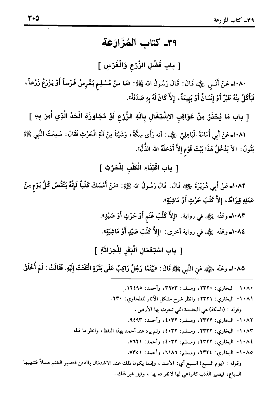 1080 - عَنْ أَنَسٍ - رضي الله عنه - قَالَ: قَالَ رَسُولُ اللَّهِ - صلى الله عليه وسلم -: «مَا مِنْ مُسْلِمٍ يَغْرِسُ غَرْسًا، أَوْ يَزْرَعُ زَرْعًا، فَيَأْكُلُ مِنْهُ طَيْرٌ أَوْ إِنْسَانٌ أَوْ بَهِيمَةٌ إِلَّا كَانَ لَهُ بِهِ صَدَقَةٌ». (بخاري: 2320)