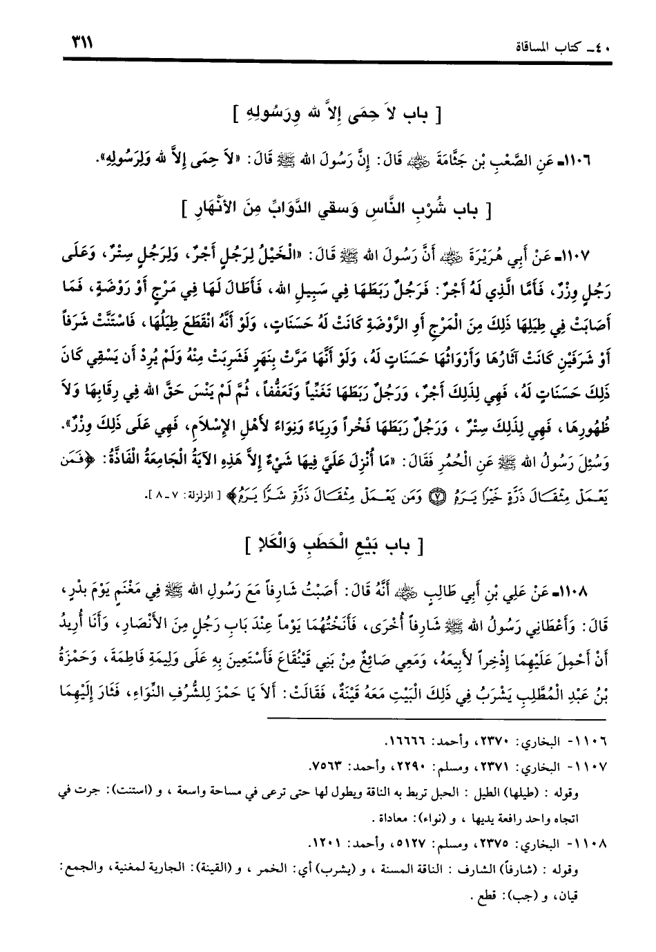 1107 - عَنْ أَبِي هُرَيْرَةَ - رضي الله عنه - أَنَّ رَسُولَ اللَّهِ - صلى الله عليه وسلم - قَالَ: «الْخَيْلُ لِرَجُلٍ أَجْرٌ، وَلِرَجُلٍ سِتْرٌ، وَعَلَى رَجُلٍ وِزْرٌ، فَأَمَّا الَّذِي لَهُ أَجْرٌ فَرَجُلٌ رَبَطَهَا فِي سَبِيلِ اللَّهِ فَأَطَالَ بِهَا فِي مَرْجٍ أَوْ رَوْضَةٍ، فَمَا أَصَابَتْ فِي طِيَلِهَا ذَلِكَ مِنَ الْمَرْجِ أَوِ الرَّوْضَةِ كَانَتْ لَهُ حَسَنَاتٍ وَلَوْ أَنَّهُ انْقَطَعَ طِيَلُهَا فَاسْتَنَّتْ شَرَفًا أَوْ شَرَفَيْنِ كَانَتْ آثَارُهَا وَأَرْوَاثُهَا حَسَنَاتٍ لَهُ، وَلَوْ أَنَّهَا مَرَّتْ بِنَهَرٍ فَشَرِبَتْ مِنْهُ وَلَمْ يُرِدْ أَنْ يَسْقِيَ كَانَ ذَلِكَ حَسَنَاتٍ لَهُ، فَهِيَ لِذَلِكَ أَجْرٌ، وَرَجُلٌ رَبَطَهَا تَغَنِّيًا وَتَعَفُّفًا ثُمَّ لَمْ يَنْسَ حَقَّ اللَّهِ فِي رِقَابِهَا وَلا ظُهُورِهَا فَهِيَ لِذَلِكَ سِتْرٌ، وَرَجُلٌ رَبَطَهَا فَخْرًا وَرِيَاءً وَنِوَاءً لأَهْلِ الإِسْلَامِ فَهِيَ عَلَى ذَلِكَ وِزْرٌ» وَسُئِلَ رَسُولُ اللَّهِ - صلى الله عليه وسلم - عَنِ الْحُمُرِ فَقَالَ: «مَا أُنْزِلَ عَلَيَّ فِيهَا شَيْءٌ إِلَّا هَذِهِ الآيَةُ الْجَامِعَةُ الْفَاذَّةُ {فَمَنْ يَعْمَلْ مِثْقَالَ ذَرَّةٍ خَيْرًا يَرَهُ وَمَنْ يَعْمَلْ مِثْقَالَ ذَرَّةٍ شَرًّا يَرَهُ}». (بخاري: 2371)