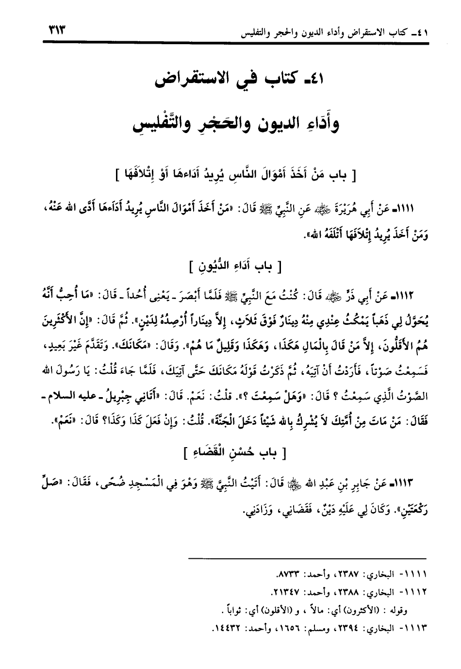 1111 - عَنْ أَبِي هُرَيْرَةَ - رضي الله عنه - عَنِ النَّبِيِّ - صلى الله عليه وسلم - قَالَ: «مَنْ أَخَذَ أَمْوَالَ النَّاسِ يُرِيدُ أَدَاءَهَا أَدَّى اللَّهُ عَنْهُ، وَمَنْ أَخَذَ يُرِيدُ إِتْلافَهَا أَتْلَفَهُ اللَّهُ». (بخاري: 2387)