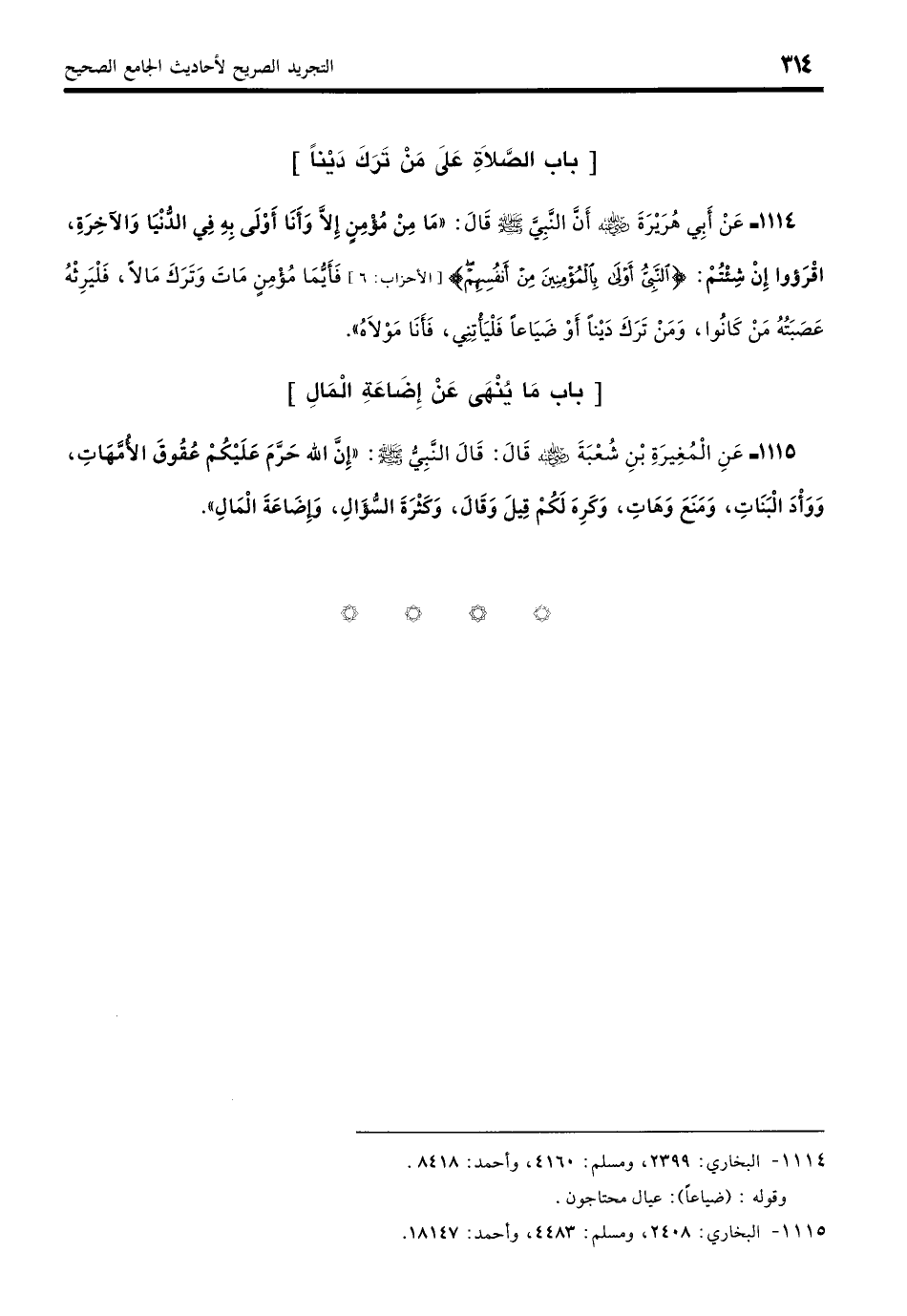 1114 - عَنْ أَبِي هُرَيْرَةَ - رضي الله عنه - أَنَّ النَّبِيَّ - صلى الله عليه وسلم - قَالَ: «مَا مِنْ مُؤْمِنٍ إِلَّا وَأَنَا أَوْلَى بِهِ فِي الدُّنْيَا وَالآخِرَةِ، اقْرَءُوا إِنْ شِئْتُمْ {النَّبِيُّ أَوْلَى بِالْمُؤْمِنِينَ مِنْ أَنْفُسِهِمْ} فَأَيُّمَا مُؤْمِنٍ مَاتَ وَتَرَكَ مَالًا فَلْيَرِثْهُ عَصَبَتُهُ مَنْ كَانُوا، وَمَنْ تَرَكَ دَيْنًا أَوْ ضَيَاعًا فَلْيَأْتِنِي فَأَنَا مَوْلاهُ». (بخاري: 2399)