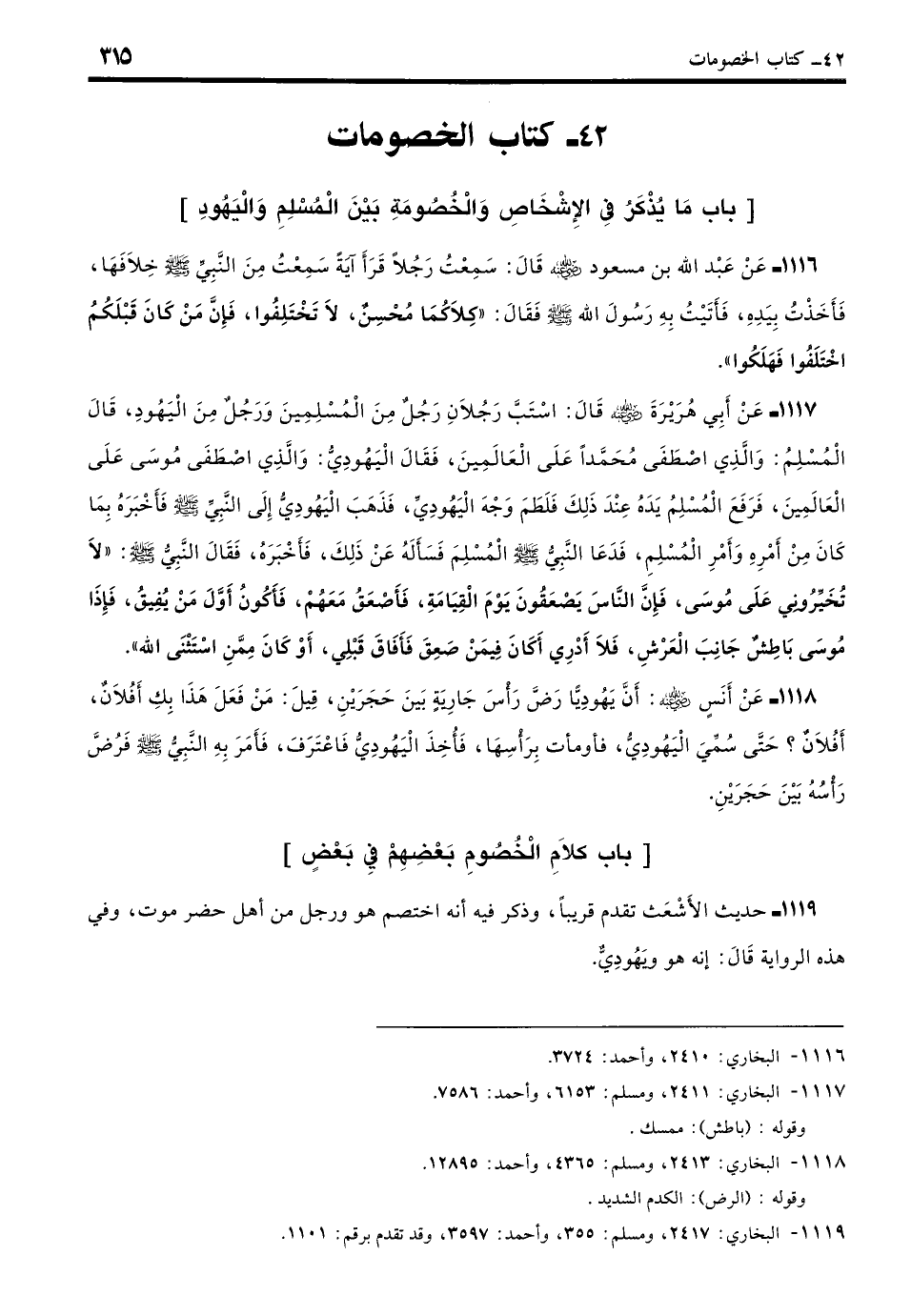 1117 - عَنْ أَبِي هُرَيْرَةَ - رضي الله عنه - قَالَ: اسْتَبَّ رَجُلانِ رَجُلٌ مِنَ الْمُسْلِمِينَ وَرَجُلٌ مِنَ الْيَهُودِ، قَالَ الْمُسْلِمُ: وَالَّذِي اصْطَفَى مُحَمَّدًا عَلَى الْعَالَمِينَ، فَقَالَ الْيَهُودِيُّ: وَالَّذِي اصْطَفَى مُوسَى عَلَى الْعَالَمِينَ، فَرَفَعَ الْمُسْلِمُ يَدَهُ عِنْدَ ذَلِكَ فَلَطَمَ وَجْهَ الْيَهُودِيِّ، فَذَهَبَ الْيَهُودِيُّ إِلَى النَّبِيِّ - صلى الله عليه وسلم - فَأَخْبَرَهُ بِمَا كَانَ مِنْ أَمْرِهِ وَأَمْرِ الْمُسْلِمِ، فَدَعَا النَّبِيُّ - صلى الله عليه وسلم - الْمُسْلِمَ فَسَأَلَهُ عَنْ ذَلِكَ فَأَخْبَرَهُ، فَقَالَ النَّبِيُّ - صلى الله عليه وسلم -: «لا تُخَيِّرُونِي عَلَى مُوسَى فَإِنَّ النَّاسَ يَصْعَقُونَ يَوْمَ الْقِيَامَةِ فَأَصْعَقُ مَعَهُمْ فَأَكُونُ أَوَّلَ مَنْ يُفِيقُ فَإِذَا مُوسَى بَاطِشٌ جَانِبَ الْعَرْشِ، فَلا أَدْرِي أَكَانَ فِيمَنْ صَعِقَ فَأَفَاقَ قَبْلِي أَوْ كَانَ مِمَّنِ اسْتَثْنَى اللَّهُ». (بخاري: 2411)