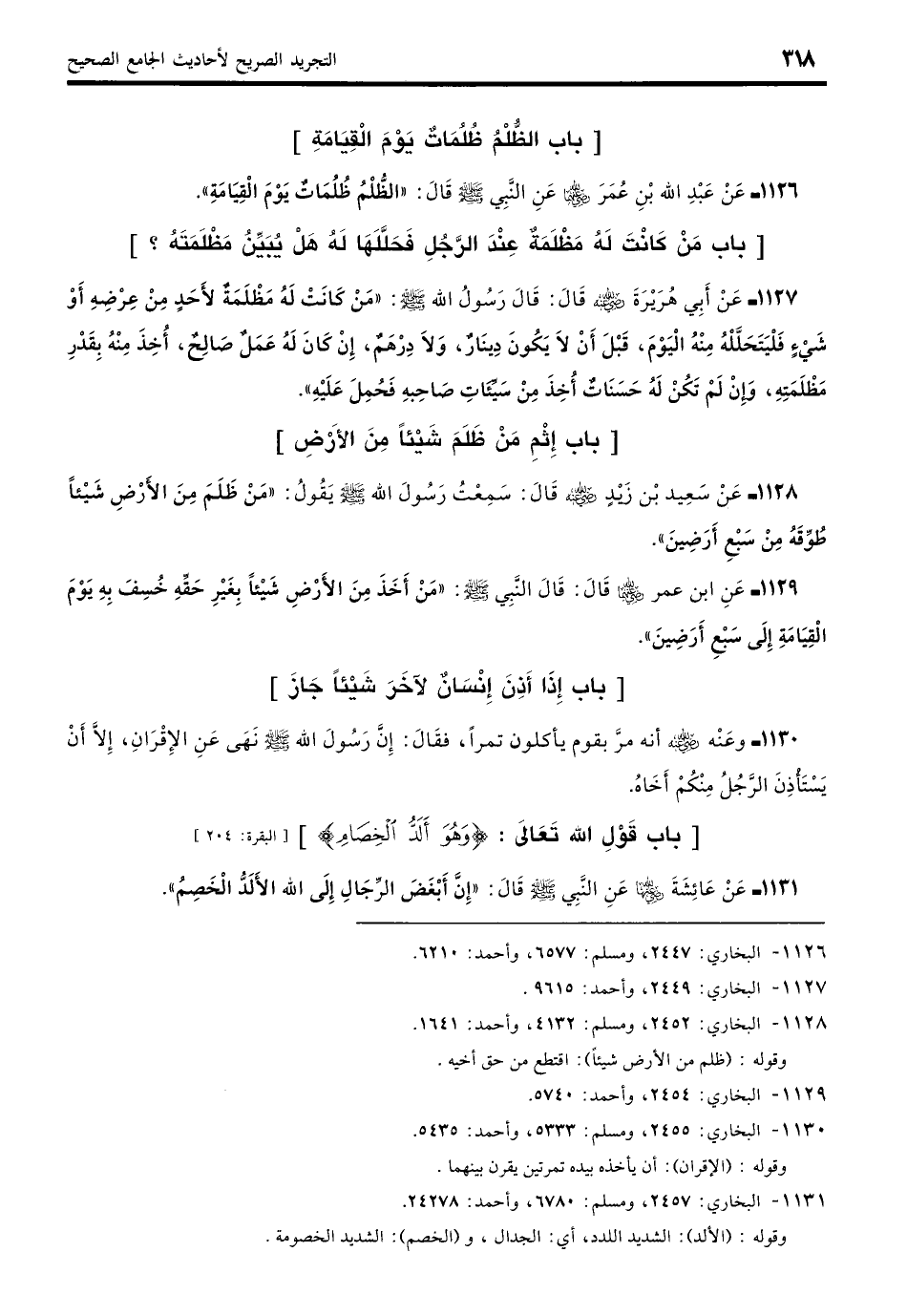 1126 - عَنْ عَبْدِ اللَّهِ بْنِ عُمَرَ - رضي الله عنهما - عَنِ النَّبِيِّ - صلى الله عليه وسلم - قَالَ: «الظُّلْمُ ظُلُمَاتٌ يَوْمَ الْقِيَامَةِ». (بخاري: 2447)