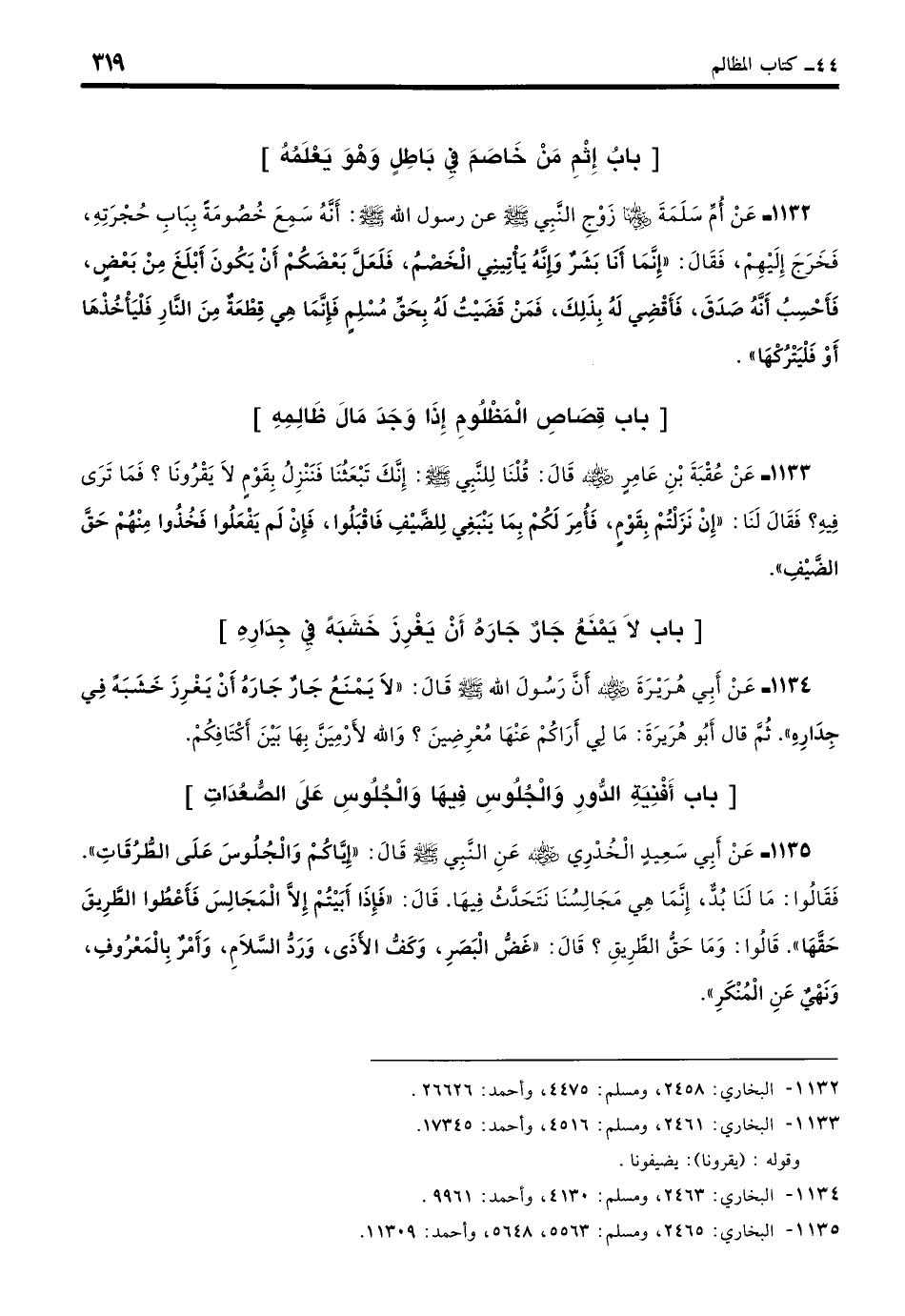 1135 - عَنْ أَبِي سَعِيدٍ الْخُدْرِيِّ - رضي الله عنه - عَنِ النَّبِيِّ - صلى الله عليه وسلم - قَالَ: «إِيَّاكُمْ وَالْجُلُوسَ عَلَى الطُّرُقَاتِ». فَقَالُوا: مَا لَنَا بُدٌّ إِنَّمَا هِيَ مَجَالِسُنَا نَتَحَدَّثُ فِيهَا، قَالَ: «فَإِذَا أَبَيْتُمْ إِلَّا الْمَجَالِسَ فَأَعْطُوا الطَّرِيقَ حَقَّهَا» قَالُوا: وَمَا حَقُّ الطَّرِيقِ؟ قَالَ: «غَضُّ الْبَصَرِ وَكَفُّ الأَذَى وَرَدُّ السَّلامِ وَأَمْرٌ بِالْمَعْرُوفِ وَنَهْيٌ عَنِ الْمُنْكَرِ». (بخاري: 2465)