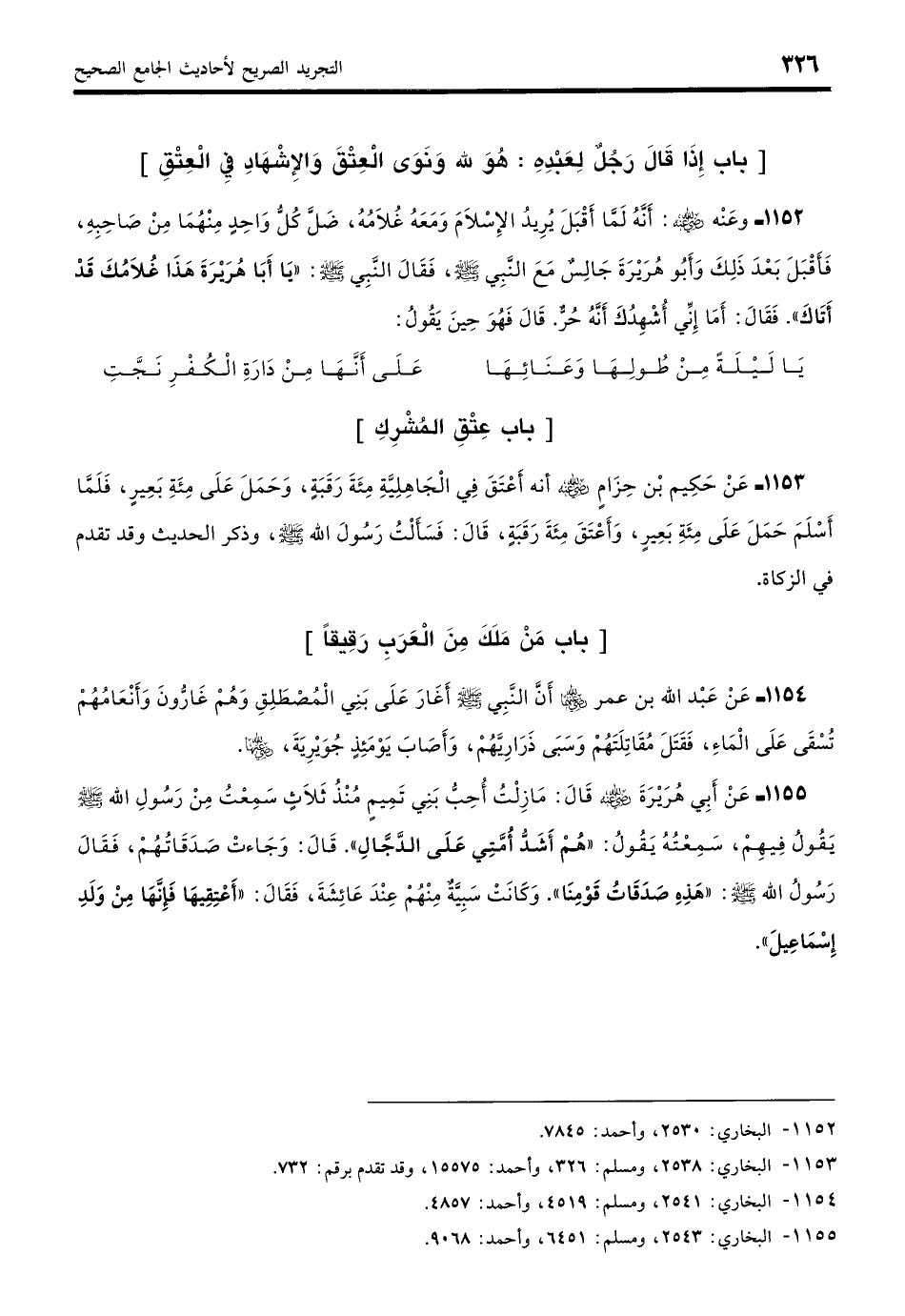 1152 - عَنْ أَبِي هُرَيْرَةَ - رضي الله عنه - أَنَّهُ لَمَّا أَقْبَلَ يُرِيدُ الإِسْلامَ وَمَعَهُ غُلامُهُ ضَلَّ كُلُّ وَاحِدٍ مِنْهُمَا مِنْ صَاحِبِهِ، فَأَقْبَلَ بَعْدَ ذَلِكَ وَأَبُو هُرَيْرَةَ جَالِسٌ مَعَ النَّبِيِّ - صلى الله عليه وسلم - فَقَالَ النَّبِيُّ - صلى الله عليه وسلم -: «يَا أَبَا هُرَيْرَةَ هَذَا غُلامُكَ قَدْ أَتَاكَ». فَقَالَ: أَمَا إِنِّي أُشْهِدُكَ أَنَّهُ حُرٌّ، قَالَ: فَهُوَ حِينَ يَقُولُ:
