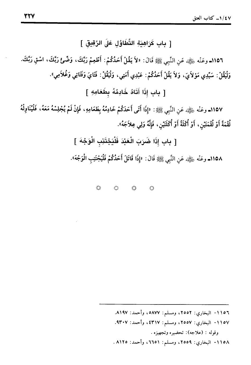 1156 - عَنْ أَبِي هُرَيْرَةَ - رضي الله عنه - عَنِ النَّبِيِّ - صلى الله عليه وسلم - أَنَّهُ قَالَ: «لا يَقُلْ أَحَدُكُمْ: أَطْعِمْ رَبَّكَ، وَضِّئْ رَبَّكَ، اسْقِ رَبَّكَ، وَلْيَقُلْ: سَيِّدِي، مَوْلايَ، وَلا يَقُلْ أَحَدُكُمْ: عَبْدِي، أَمَتِي، وَلْيَقُلْ: فَتَايَ، وَفَتَاتِي، وَغُلامِي». (بخاري: 2552)