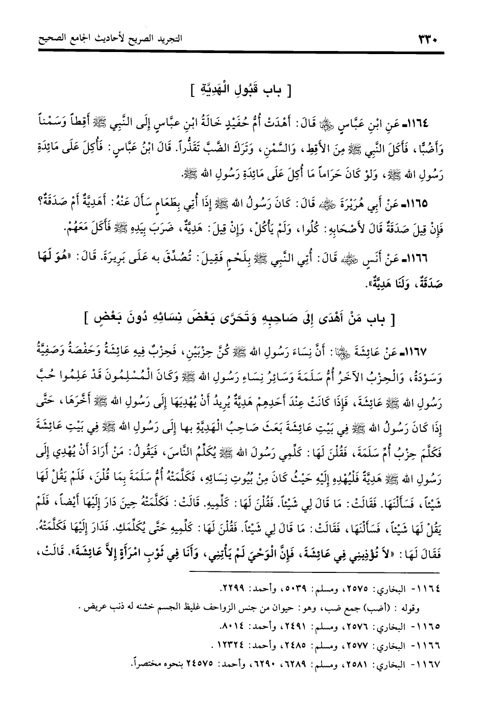 1167 - عَنْ عَائِشَةَ - رضي الله عنها -: أَنَّ نِسَاءَ رَسُولِ اللَّهِ - صلى الله عليه وسلم - كُنَّ حِزْبَيْنِ، فَحِزْبٌ فِيهِ عَائِشَةُ وَحَفْصَةُ وَصَفِيَّةُ وَسَوْدَةُ، وَالْحِزْبُ الآخَرُ أُمُّ سَلَمَةَ وَسَائِرُ نِسَاءِ رَسُولِ اللَّهِ - صلى الله عليه وسلم -، وَكَانَ الْمُسْلِمُونَ قَدْ عَلِمُوا حُبَّ رَسُولِ اللَّهِ - صلى الله عليه وسلم - عَائِشَةَ فَإِذَا كَانَتْ عِنْدَ أَحَدِهِمْ هَدِيَّةٌ يُرِيدُ أَنْ يُهْدِيَهَا إِلَى رَسُولِ اللَّهِ - صلى الله عليه وسلم - أَخَّرَهَا حَتَّى إِذَا كَانَ رَسُولُ اللَّهِ - صلى الله عليه وسلم - فِي بَيْتِ عَائِشَةَ بَعَثَ صَاحِبُ الْهَدِيَّةِ بِهَا إِلَى رَسُولِ اللَّهِ - صلى الله عليه وسلم - فِي بَيْتِ عَائِشَةَ، فَكَلَّمَ حِزْبُ أُمِّ سَلَمَةَ فَقُلْنَ لَهَا: كَلِّمِي رَسُولَ اللَّهِ - صلى الله عليه وسلم - يُكَلِّمُ النَّاسَ فَيَقُولُ: مَنْ أَرَادَ أَنْ يُهْدِيَ إِلَى رَسُولِ اللَّهِ - صلى الله عليه وسلم - هَدِيَّةً فَلْيُهْدِهِ إِلَيْهِ حَيْثُ كَانَ مِنْ بُيُوتِ نِسَائِهِ، فَكَلَّمَتْهُ أُمُّ سَلَمَةَ بِمَا قُلْنَ، فَلَمْ يَقُلْ لَهَا شَيْئًا، فَسَأَلْنَهَا فَقَالَتْ: مَا قَالَ لِي شَيْئًا، فَقُلْنَ لَهَا: فَكَلِّمِيهِ، قَالَتْ: فَكَلَّمَتْهُ حِينَ دَارَ إِلَيْهَا أَيْضًا، فَلَمْ يَقُلْ لَهَا شَيْئًا، فَسَأَلْنَهَا فَقَالَتْ: مَا قَالَ لِي شَيْئًا، فَقُلْنَ لَهَا: كَلِّمِيهِ حَتَّى يُكَلِّمَكِ، فَدَارَ إِلَيْهَا فَكَلَّمَتْهُ فَقَالَ لَهَا: «لا تُؤْذِينِي فِي عَائِشَةَ، فَإِنَّ الْوَحْيَ لَمْ يَأْتِنِي وَأَنَا فِي ثَوْبِ امْرَأَةٍ إِلَّا عَائِشَةَ» قَالَتْ: