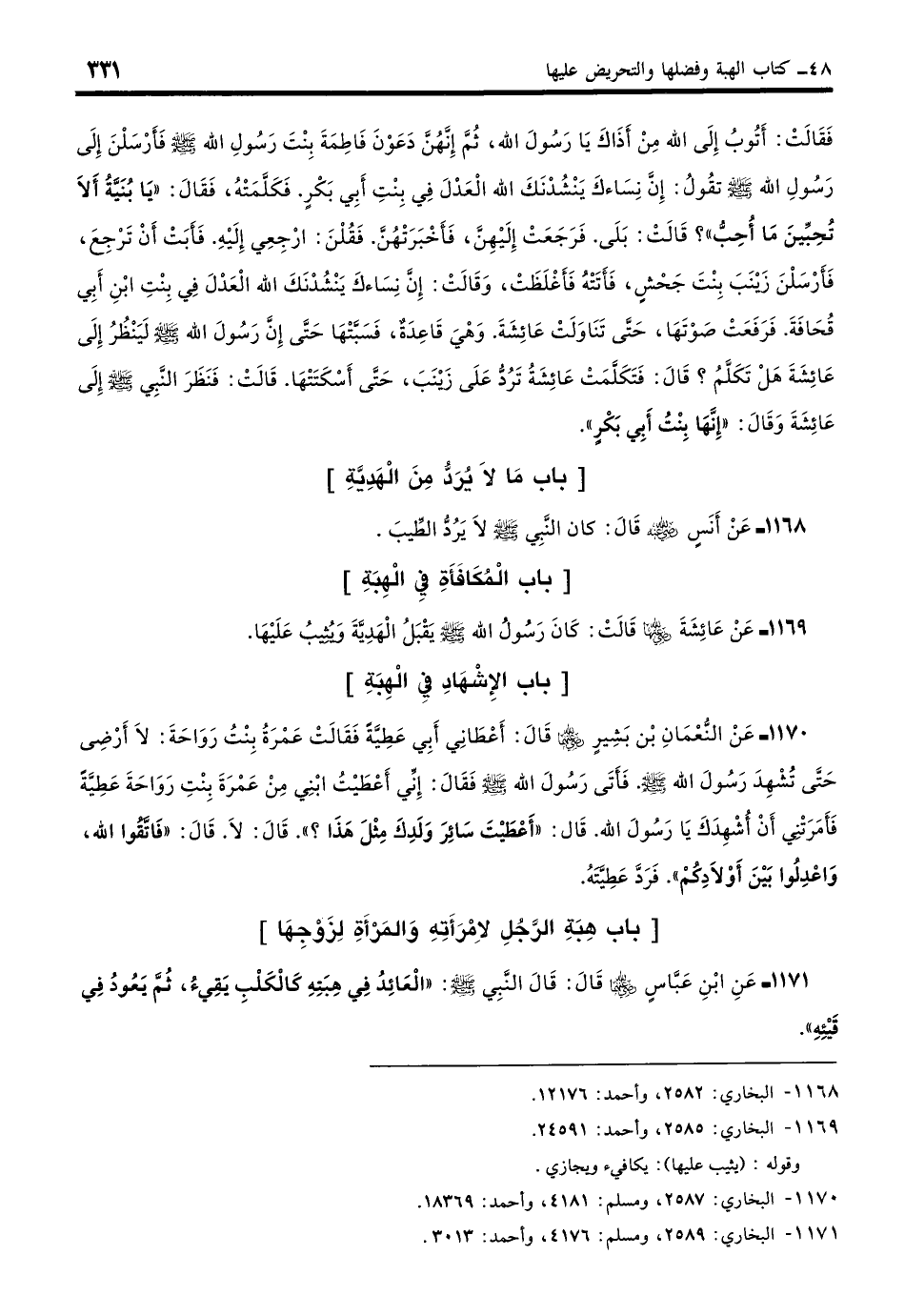 1170 - عَنْ النُّعْمَان بْنَ بَشِيرٍ - رضي الله عنهما - قال: أَعْطَانِي أَبِي عَطِيَّةً فَقَالَتْ عَمْرَةُ بِنْتُ رَوَاحَةَ: لا أَرْضَى حَتَّى تُشْهِدَ رَسُولَ اللَّهِ - صلى الله عليه وسلم -، فَأَتَى رَسُولَ اللَّهِ - صلى الله عليه وسلم - فَقَالَ: إِنِّي أَعْطَيْتُ ابْنِي مِنْ عَمْرَةَ بِنْتِ رَوَاحَةَ عَطِيَّةً، فَأَمَرَتْنِي أَنْ أُشْهِدَكَ يَا رَسُولَ اللَّهِ، قَالَ: «أَعْطَيْتَ سَائِرَ وَلَدِكَ مِثْلَ هَذَا»؟ قَالَ: لا قَالَ: «فَاتَّقُوا اللَّهَ وَاعْدِلُوا بَيْنَ أَوْلادِكُمْ» قَالَ: فَرَجَعَ فَرَدَّ عَطِيَّتَهُ. (بخاري: 2587)