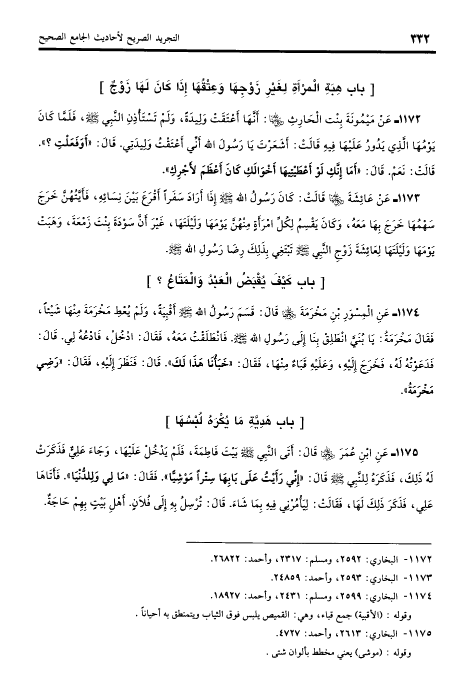 1172 - عَنْ مَيْمُونَةَ بِنْتَ الْحَارِثِ - رضي الله عنها - أَنَّهَا أَعْتَقَتْ وَلِيدَةً وَلَمْ تَسْتَأْذِنِ النَّبِيَّ - صلى الله عليه وسلم -، فَلَمَّا كَانَ يَوْمُهَا الَّذِي يَدُورُ عَلَيْهَا فِيهِ قَالَتْ: أَشَعَرْتَ يَا رَسُولَ اللَّهِ أَنِّي أَعْتَقْتُ وَلِيدَتِي، قَالَ: «أَوَفَعَلْتِ؟» قَالَتْ: نَعَمْ. قَالَ: «أَمَا إِنَّكِ لَوْ أَعْطَيْتِهَا أَخْوَالَكِ كَانَ أَعْظَمَ لأَجْرِكِ».